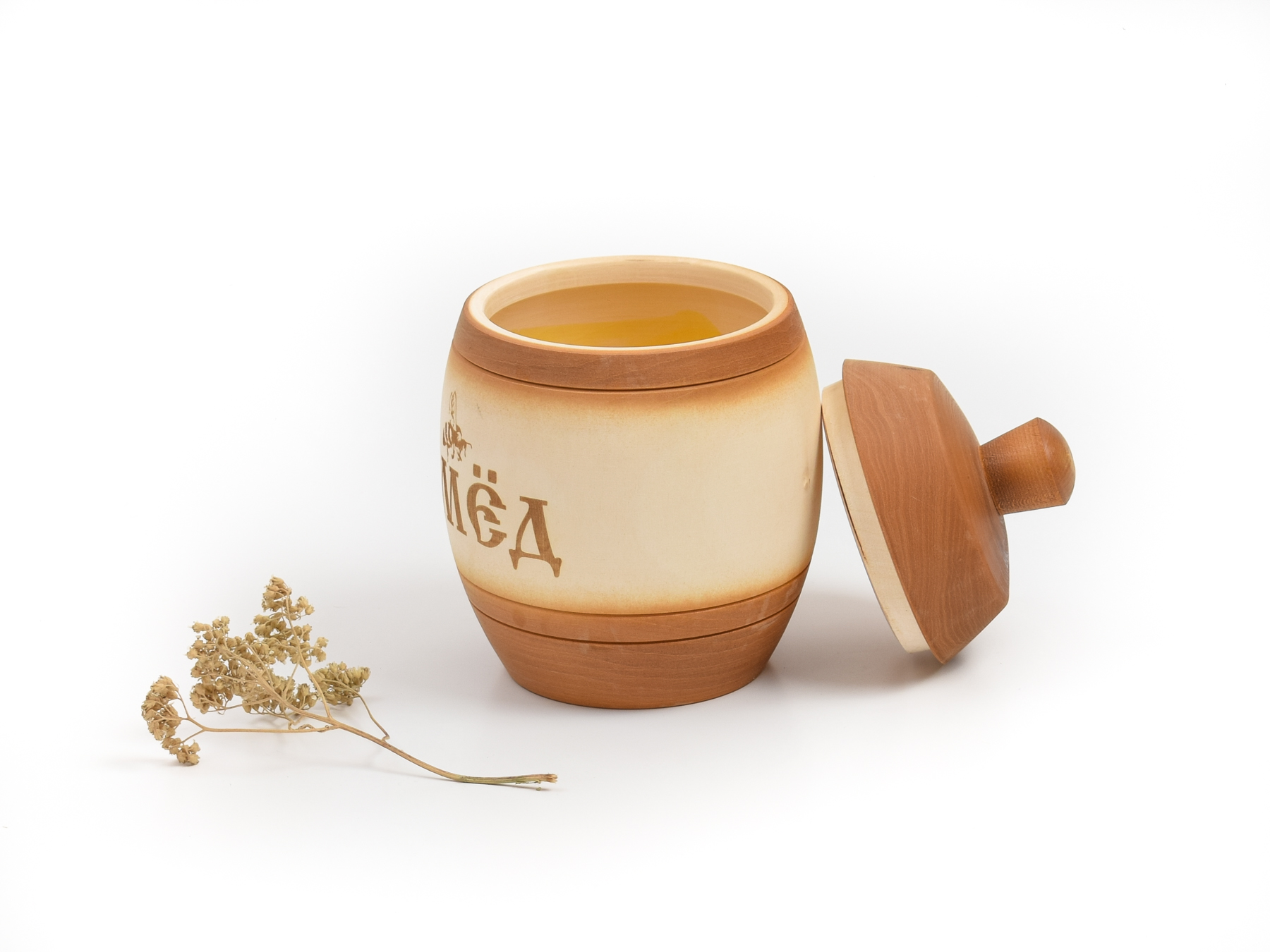 Бочонок деревянный для меда. Объем бочонка 1 литр. Вмещает 0,9 кг меда. Выточен из цельного куска липы и покрыт внутри натуральным пчелиным воском.