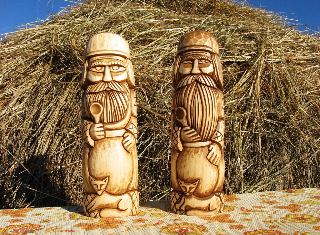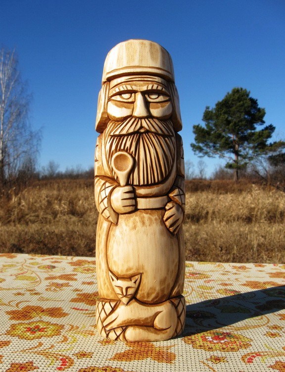 Кот или кошка – традиционные спутники домового. Ложка в руке домового символизирует достаток в семье.