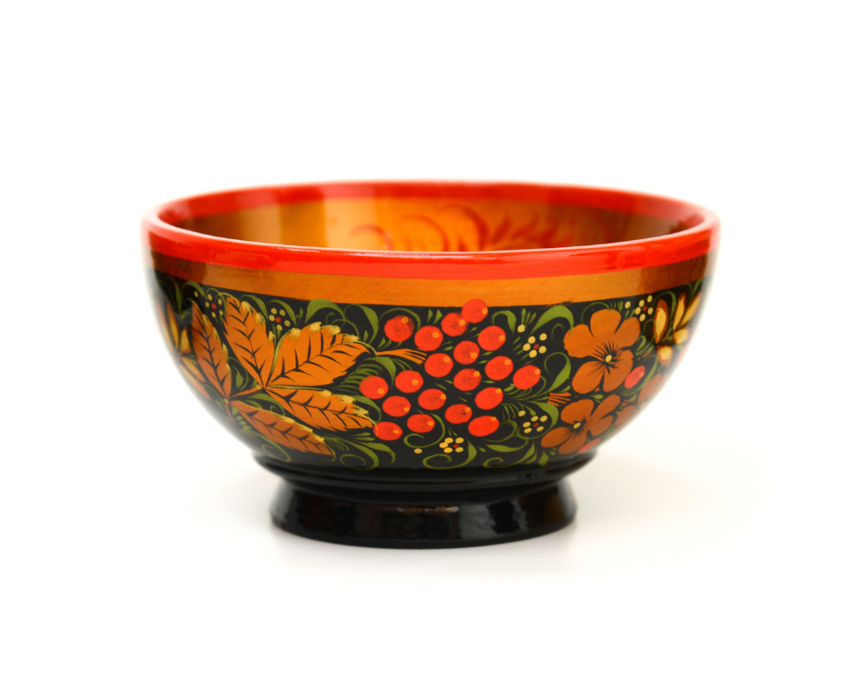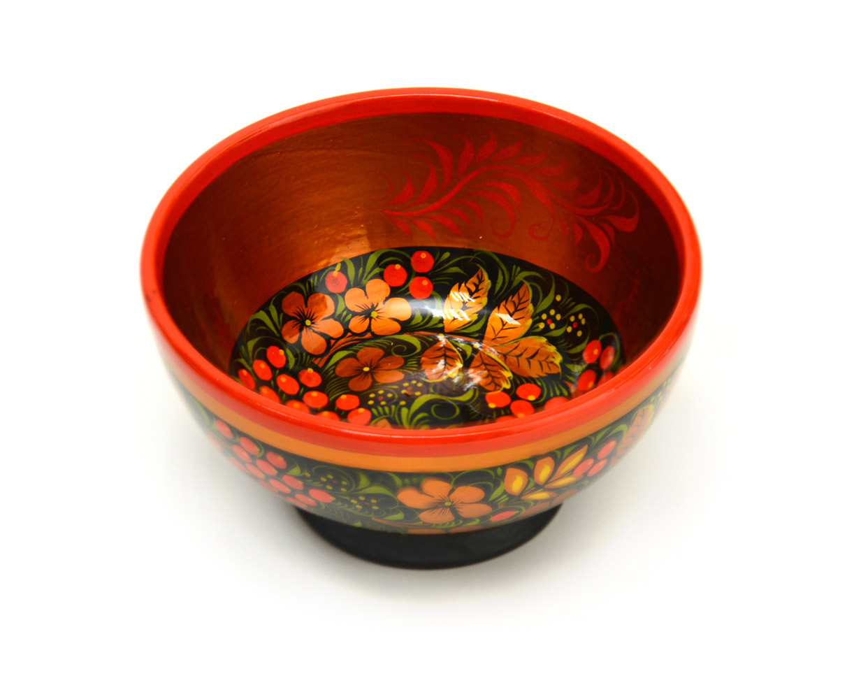 Небольшая деревянная чашка из осины с хохломской росписью. Подойдет для первых и вторых блюд. Можно выкладывать горячую и холодную пищу.