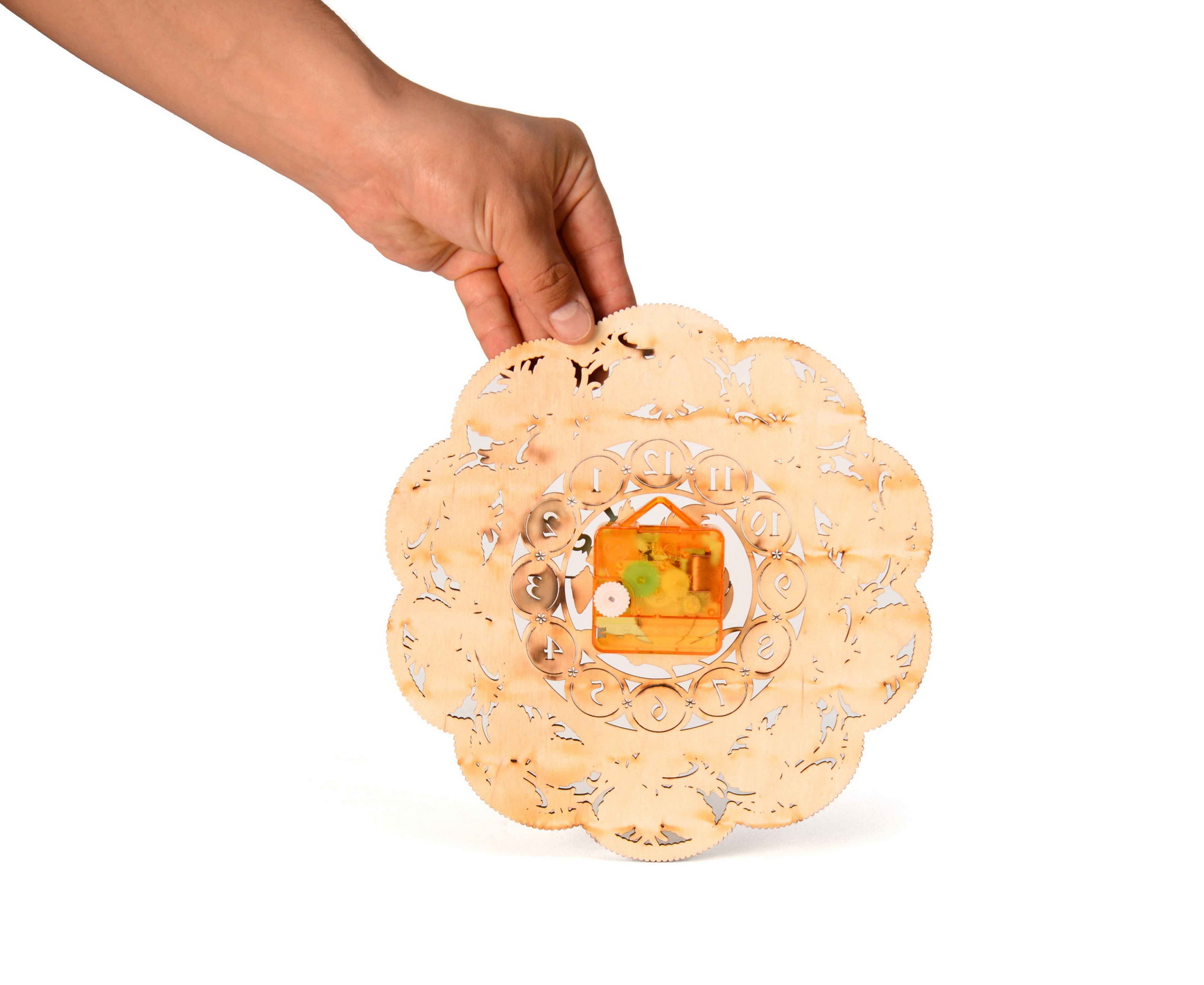 Рисунок нанесен с помощью лазерной гравировки. Часы оснащены кварцевым механизмом, что делает их ход бесшумным.