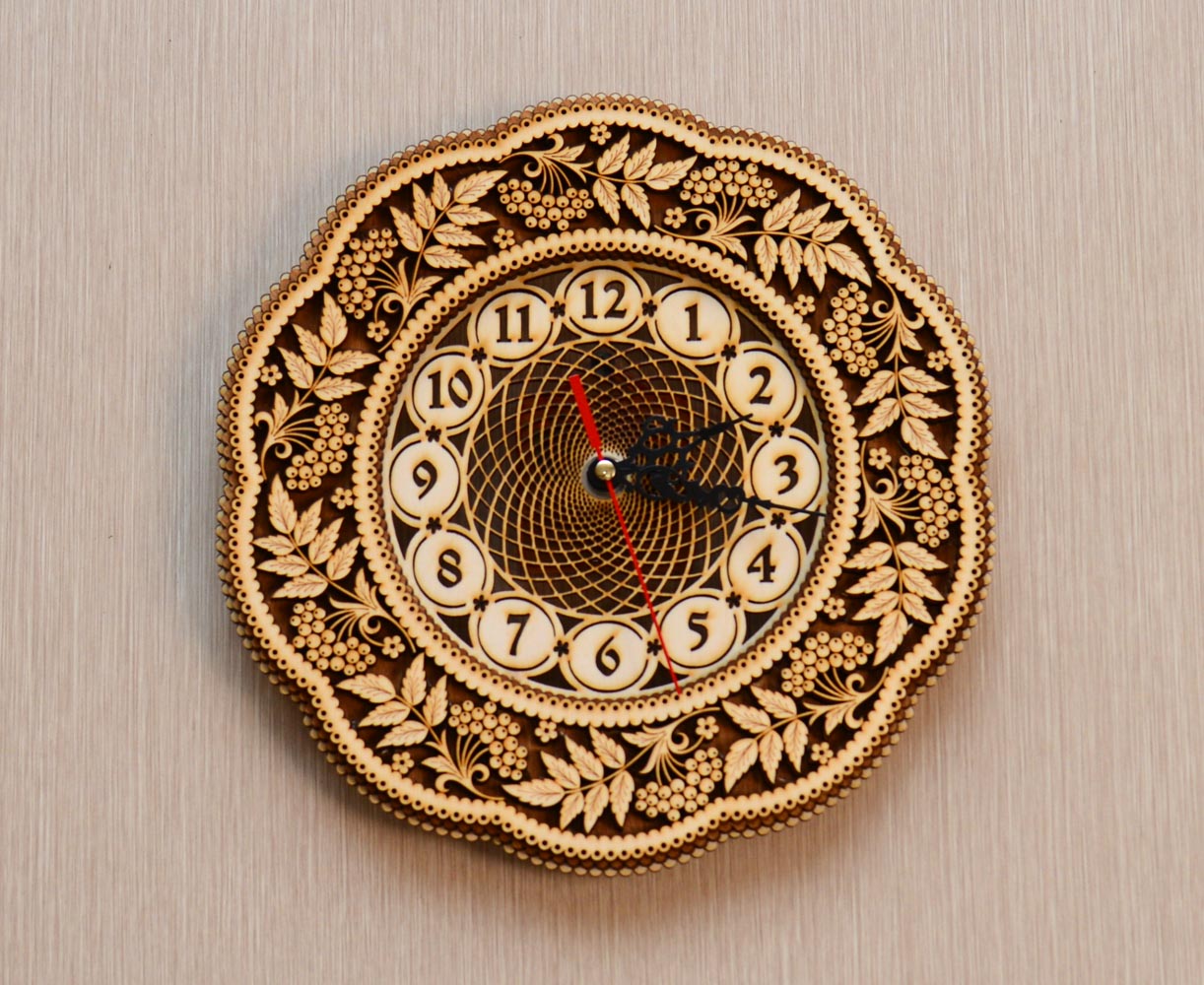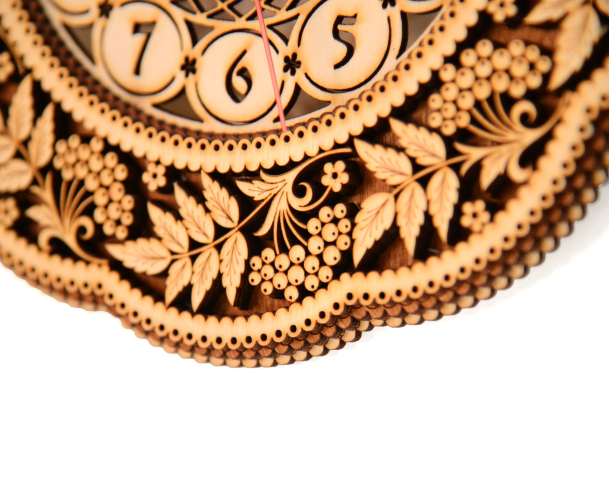 Рисунок нанесен с помощью лазерной гравировки. Часы оснащены кварцевым механизмом, что делает их ход бесшумным.