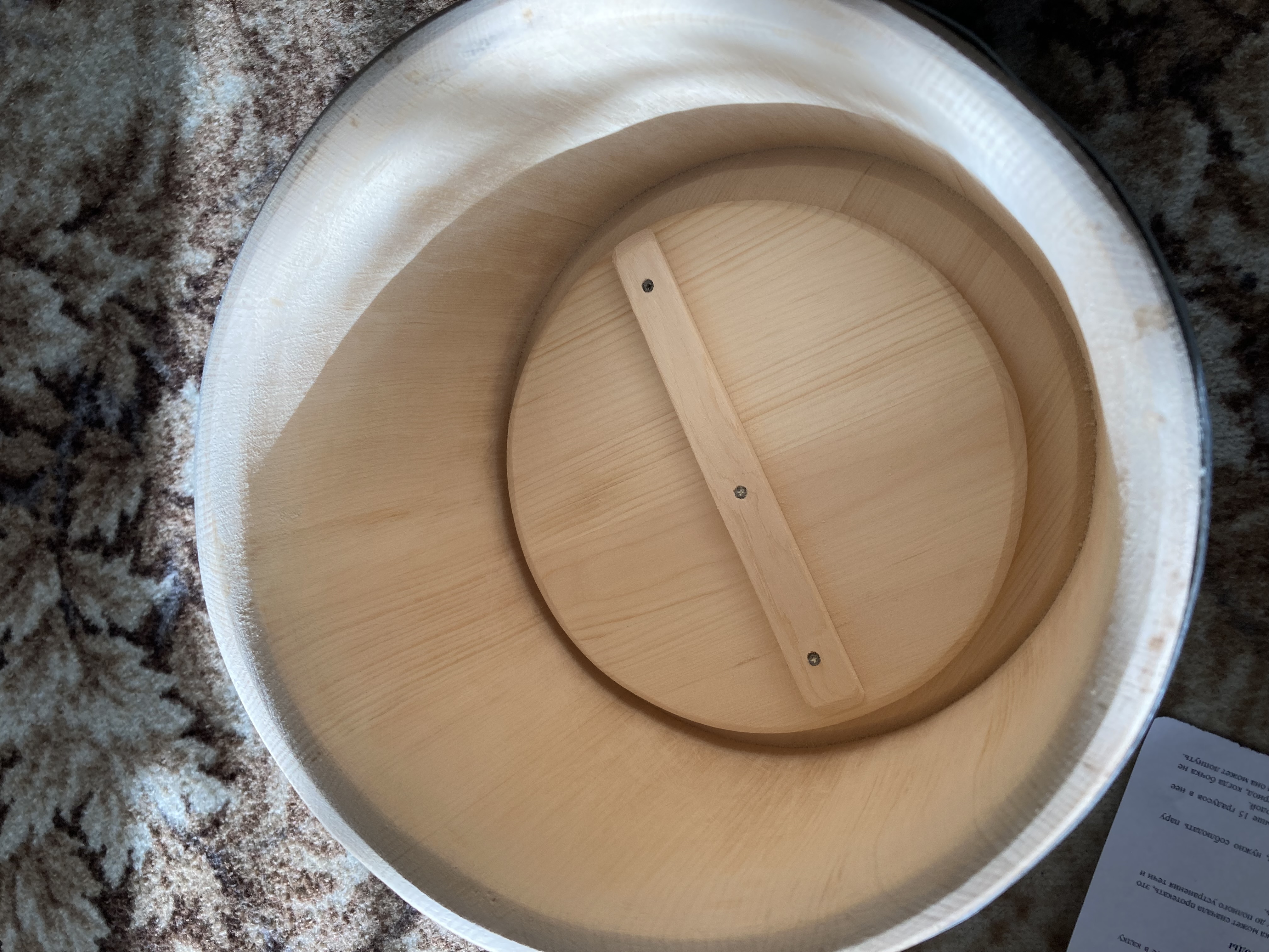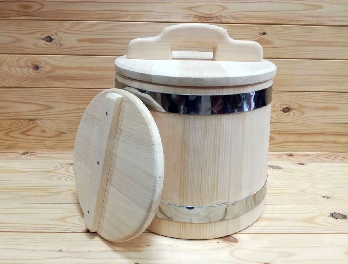 Кадка из кедра для засолки. Крышка и гнет в комплекте! Кадки и бочки используют для засолки овощей, квашения капусты, мочения яблок, ягод, соление арбузов. Также наши клиенты используют кадушки для хранения воды, сыпучих продуктов, муки.