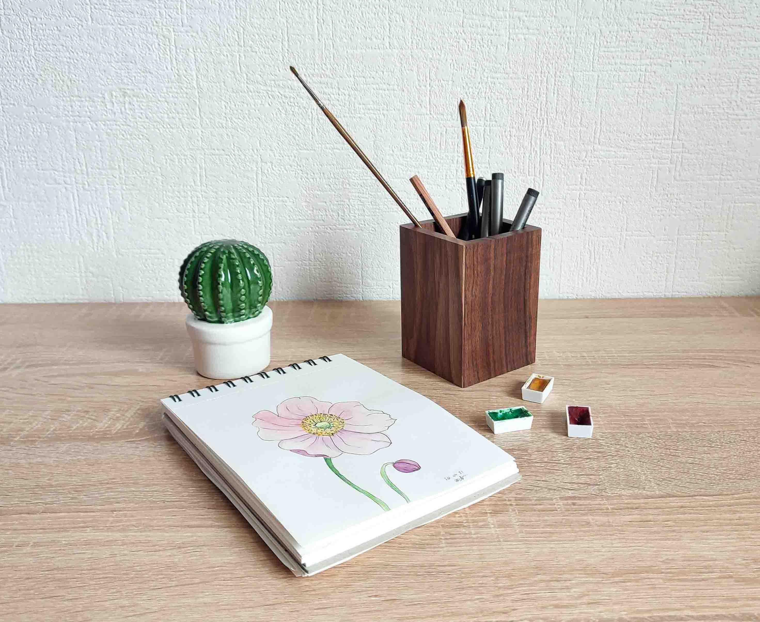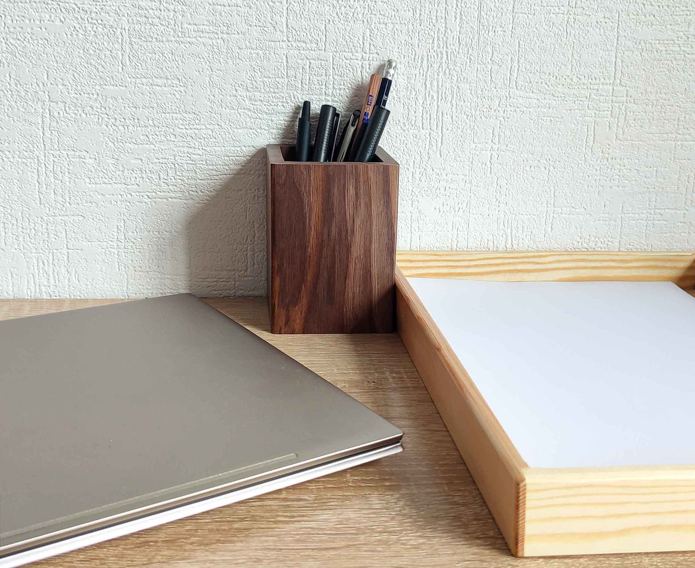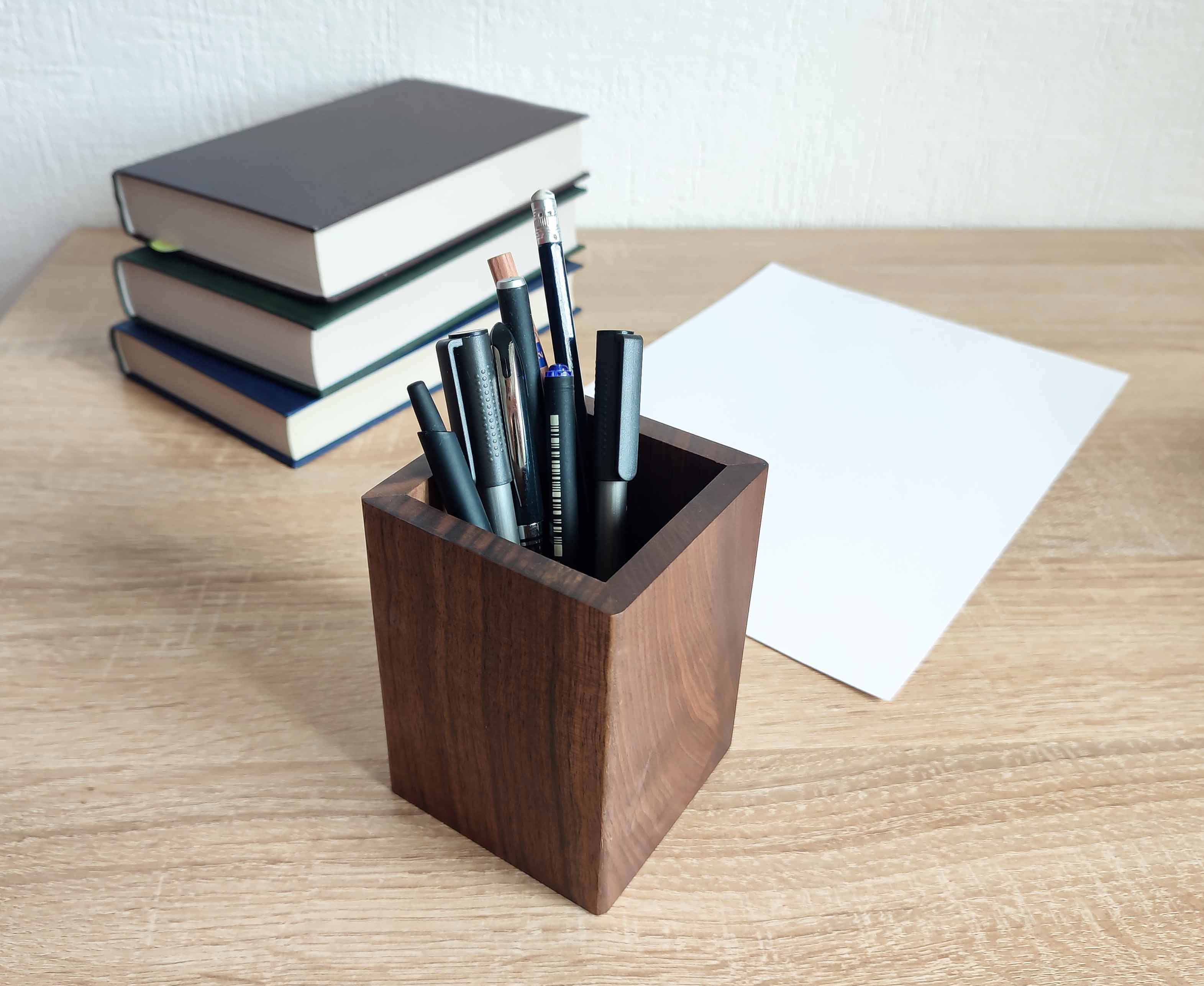 Настольный органайзер - карандашница, удобная вещь для хранения канцелярии и косметики: ножниц, ручек, карандашей, фломастеров, кистей и др. Сделана из древесины орехового дерева и покрыта лаком.