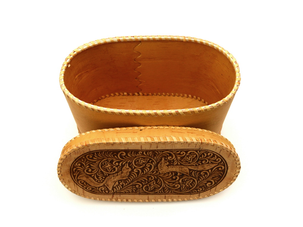 Короб из бересты небольших размеров. Форма овальная. Крышка легко снимается и одевается.