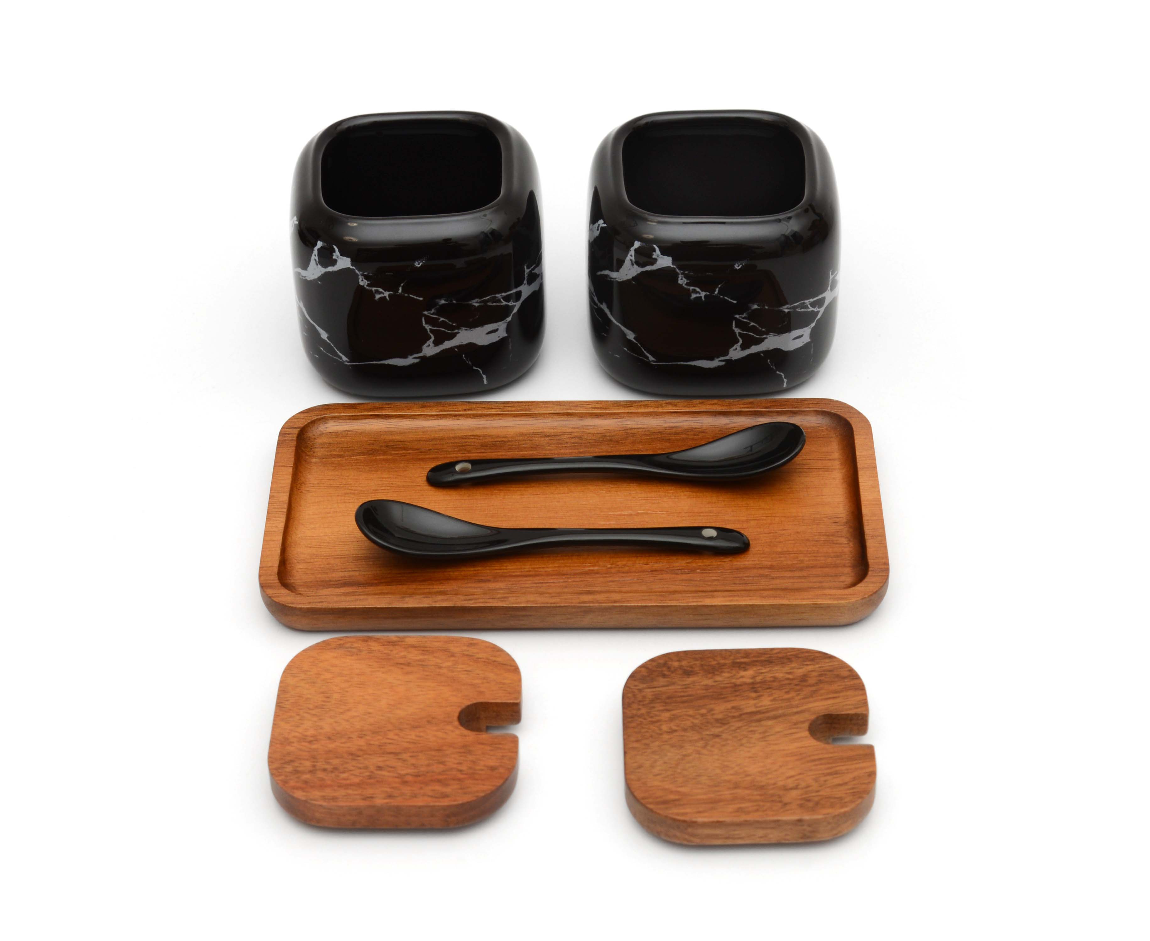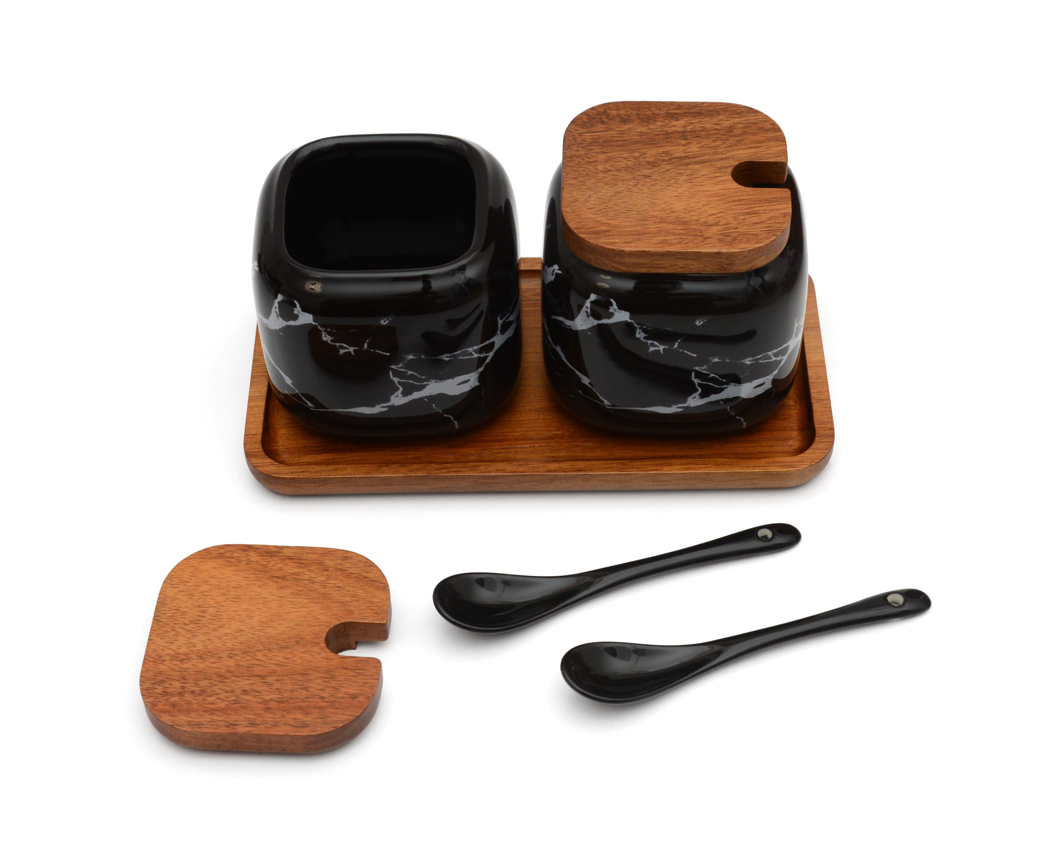 В набор входит 2 керамические баночки с ложками и крышками и деревянная подставка - сделана из акации.