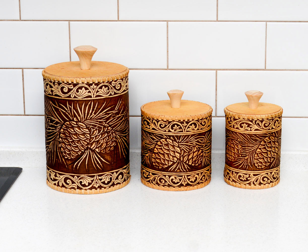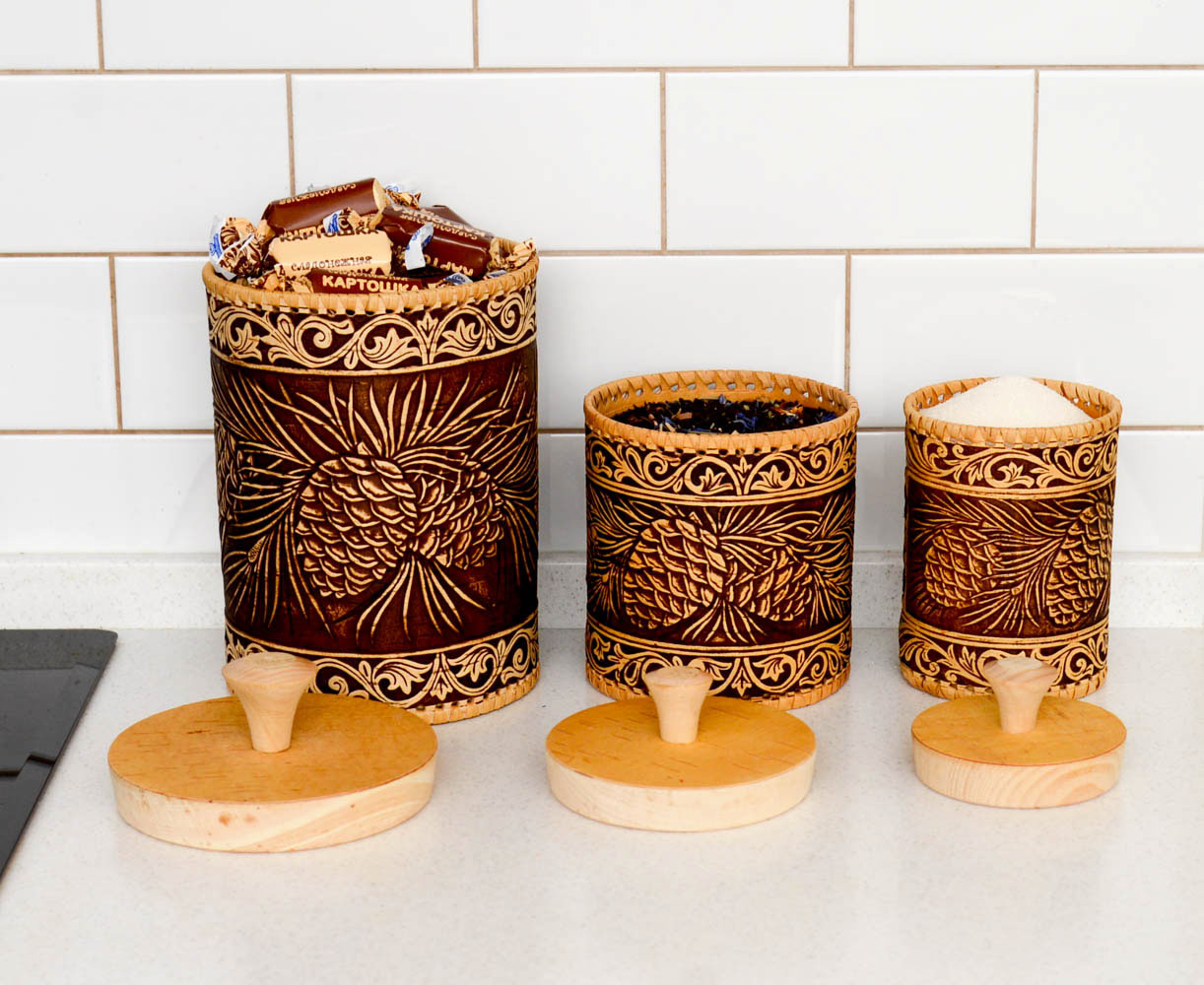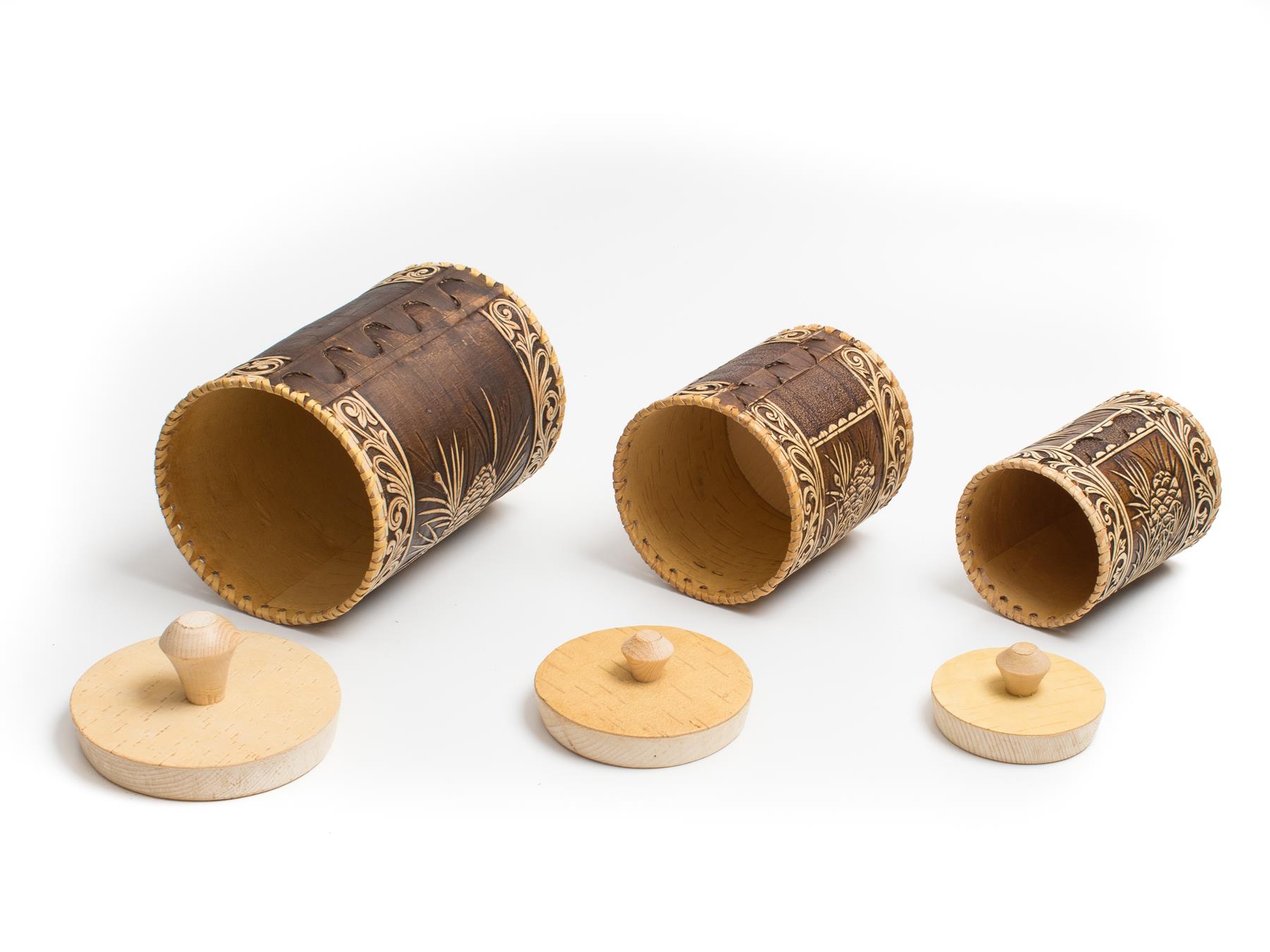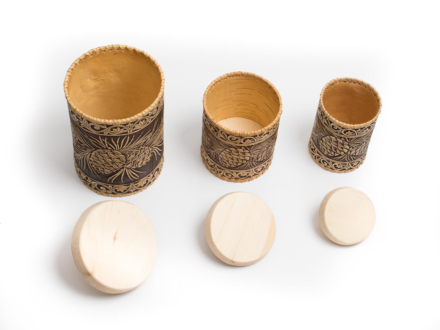 Набор из трех туесов с шишками разного размера. Объем баночек от 0,4 до 1,5 литра.