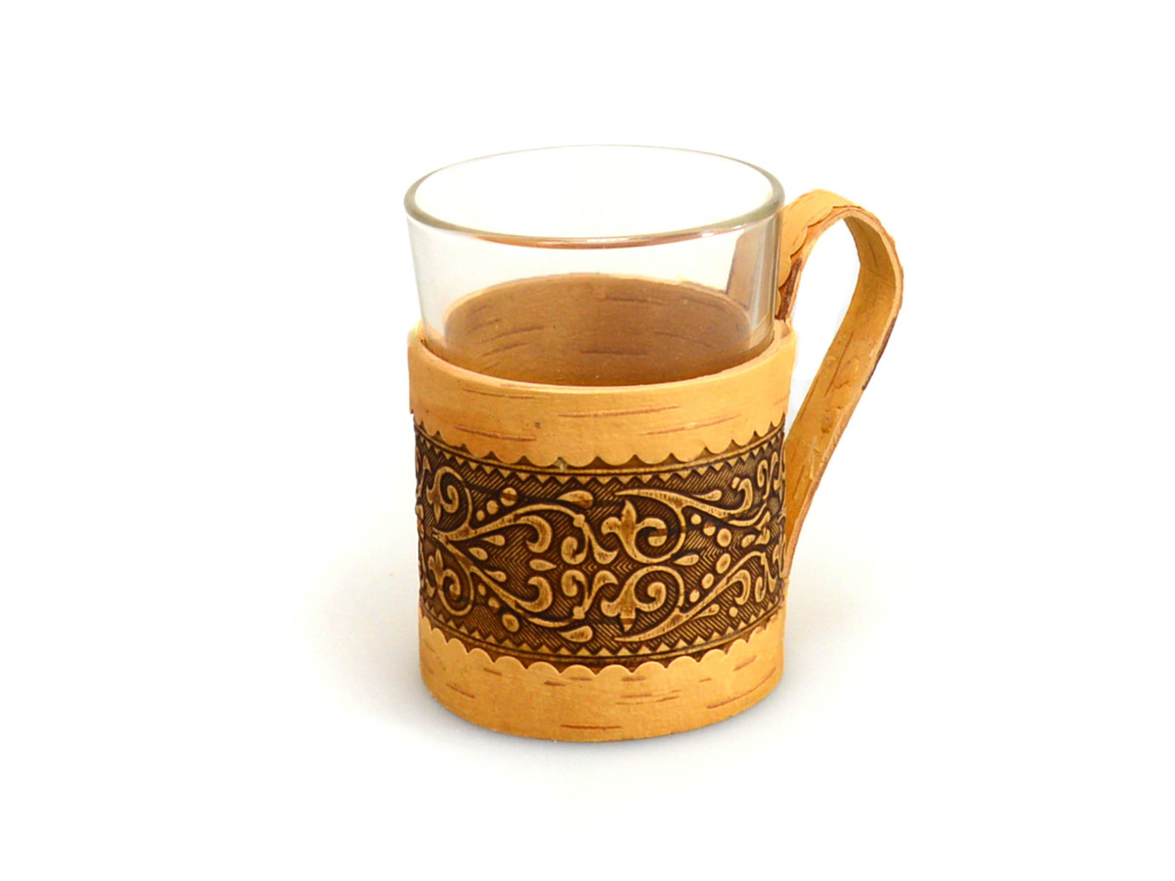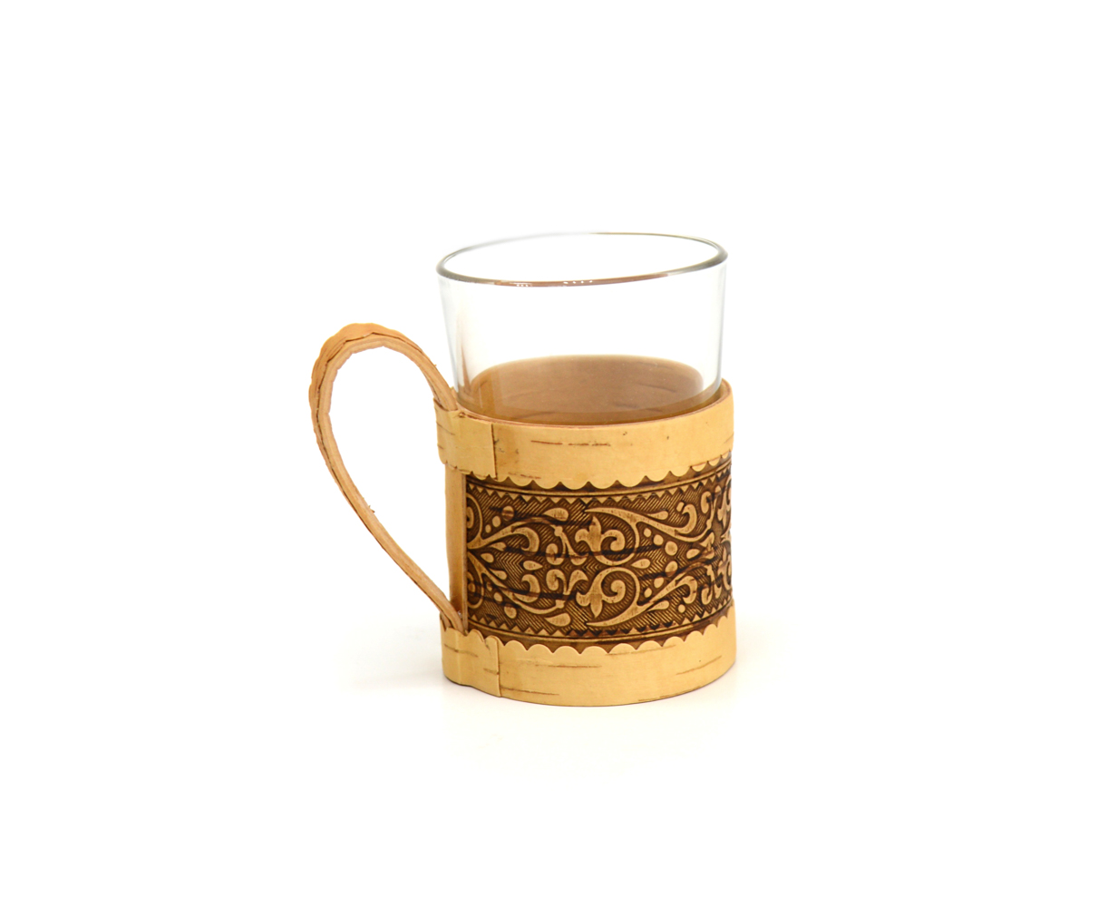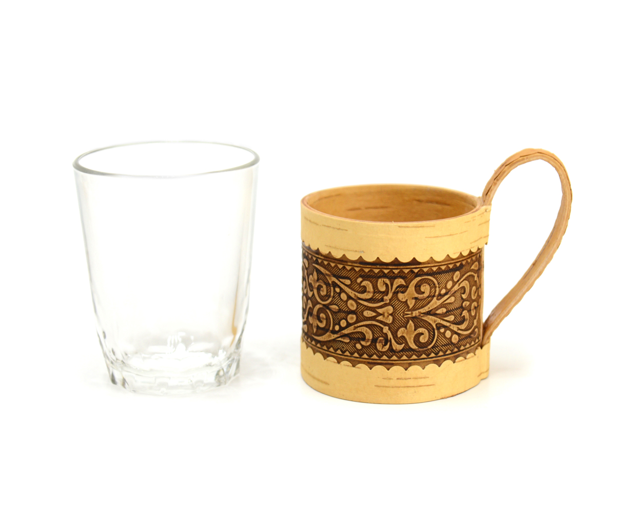 Подстаканник из бересты с красивым узором в комплекте со стеклянным стаканом, красивый, лёгкий и прочный.
