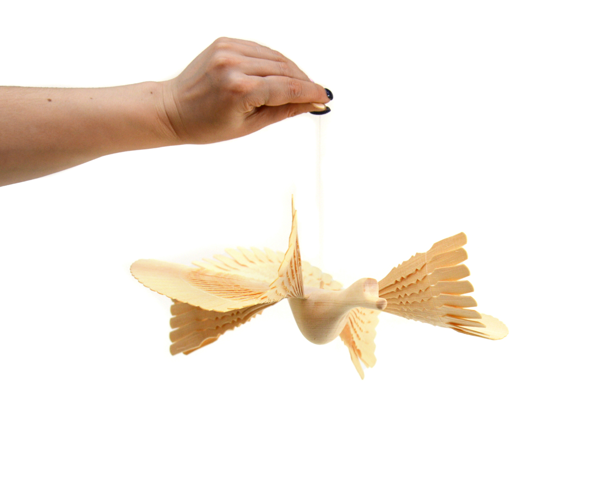 На птице имеется крючок с ниткой, при помощи которой птицу можно повесить под потолок, на люстру или над детской кроваткой.