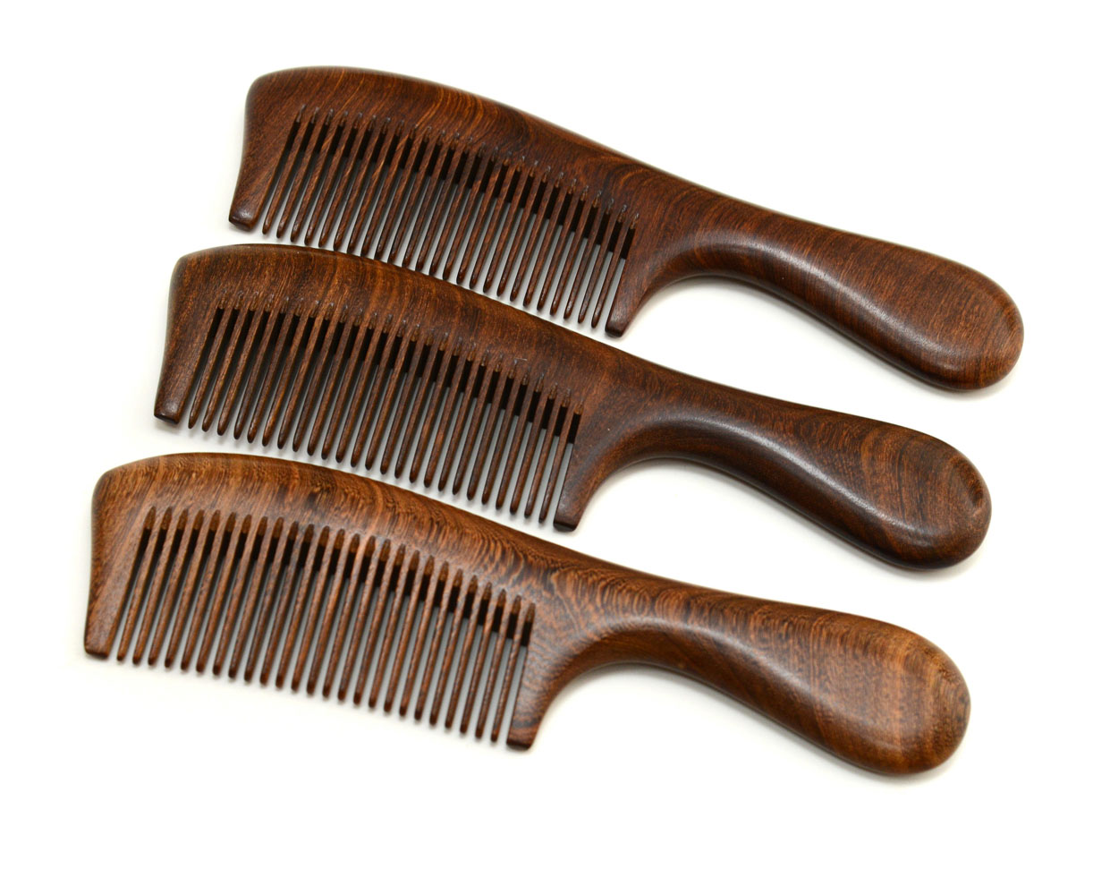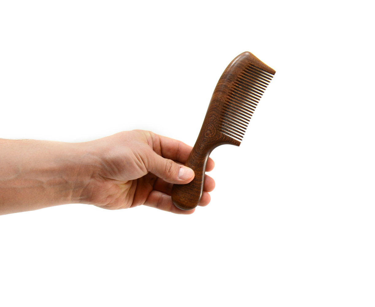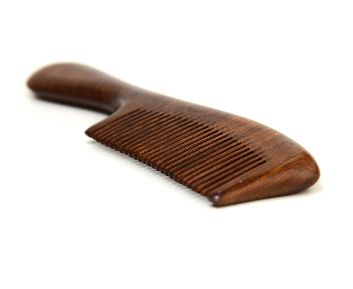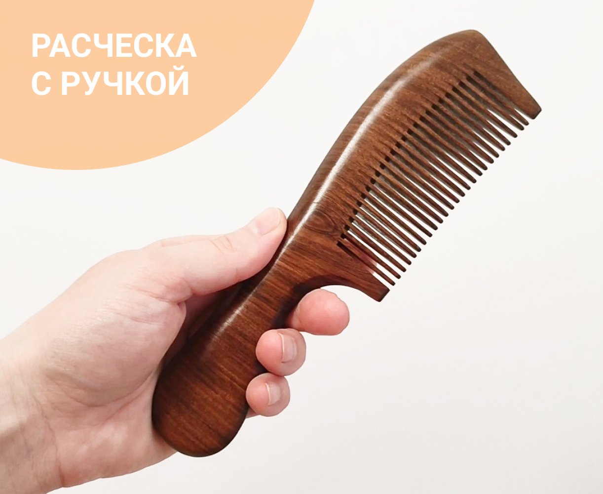 Расческа деревянная с ручкой, изготовлена из натурального сандалового дерева. Запаха сандала расческа не имеет, так как покрыта лаком.