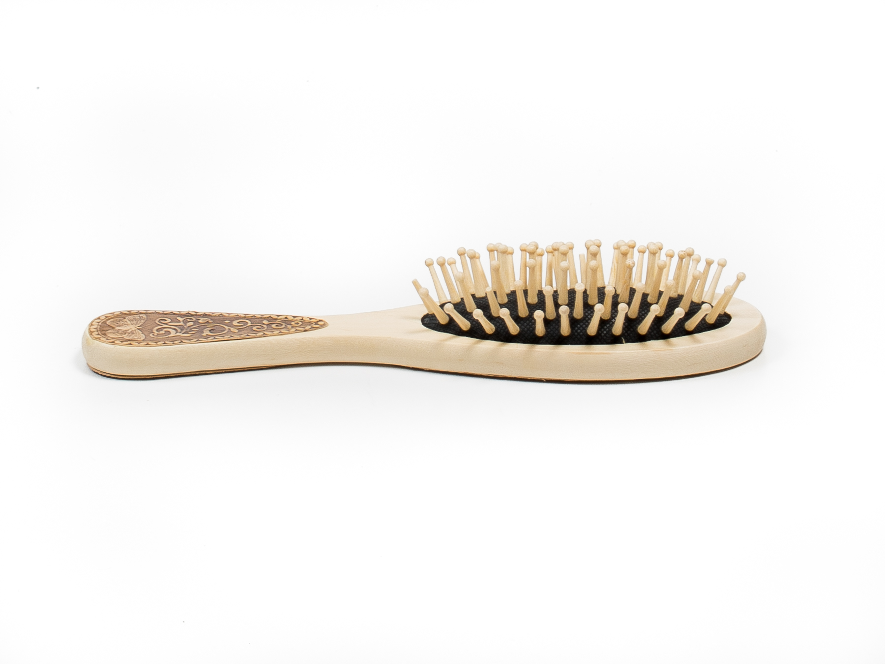 Массажка деревянная с резным декором из бересты, на ней изображены бабочки.