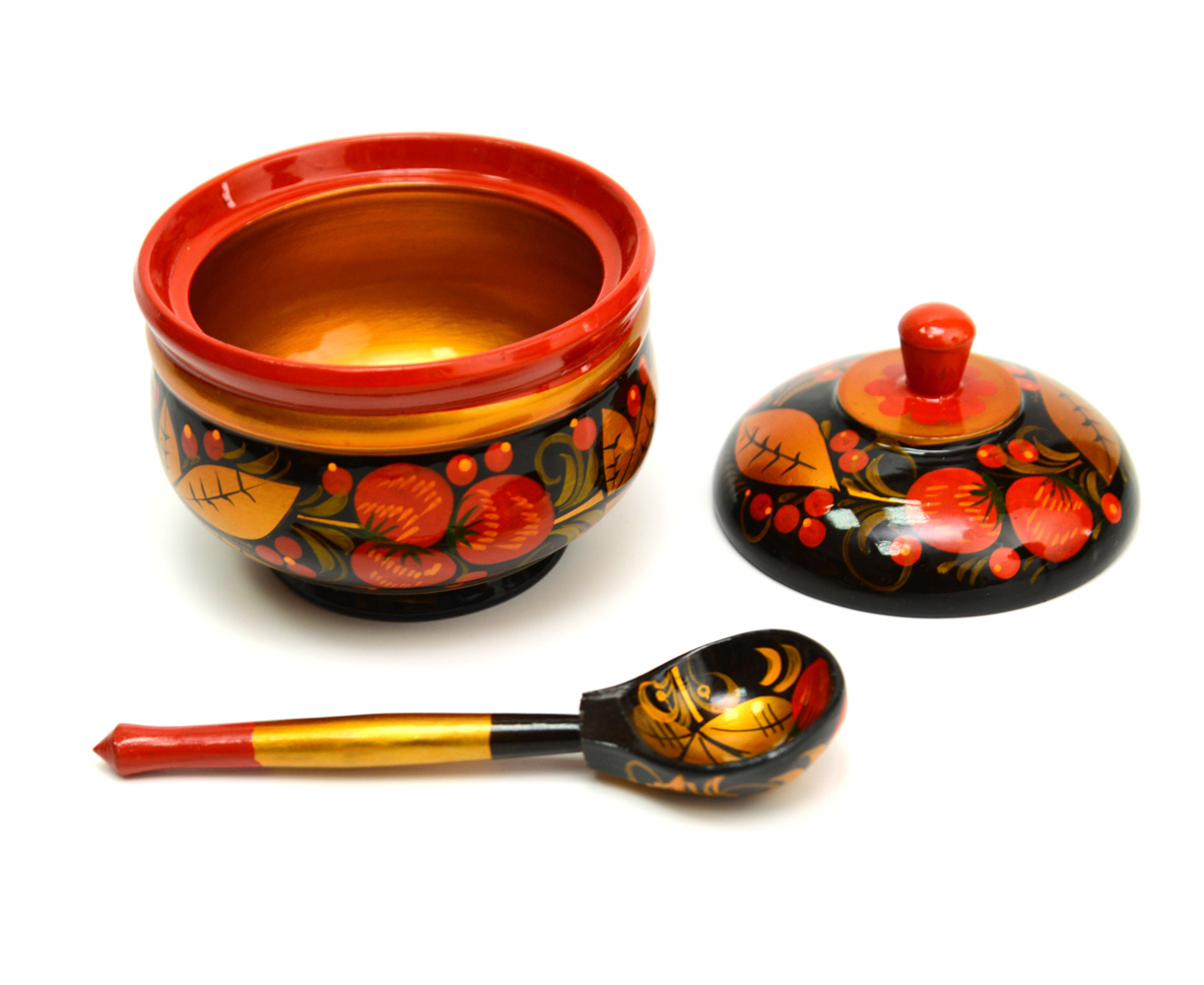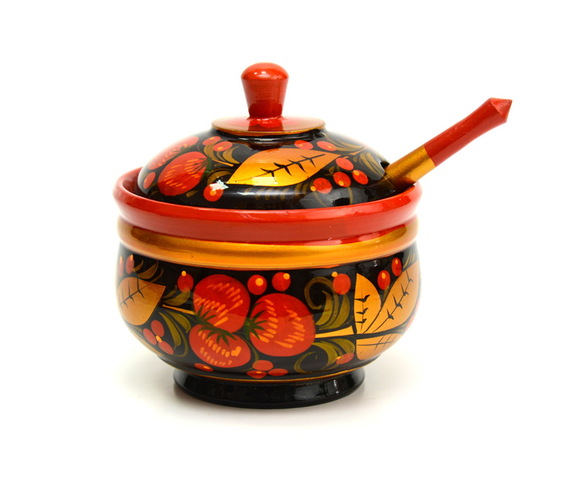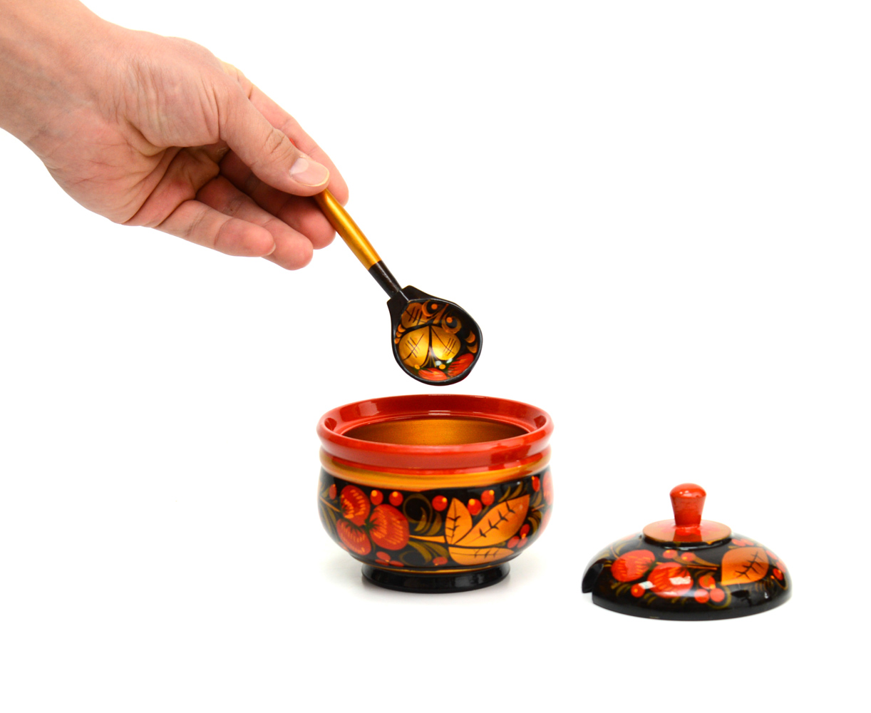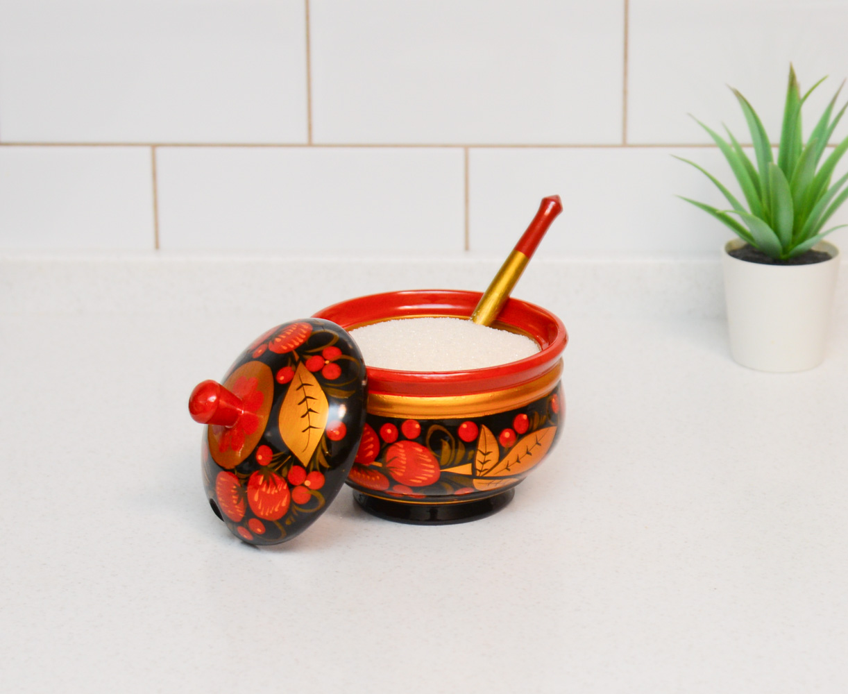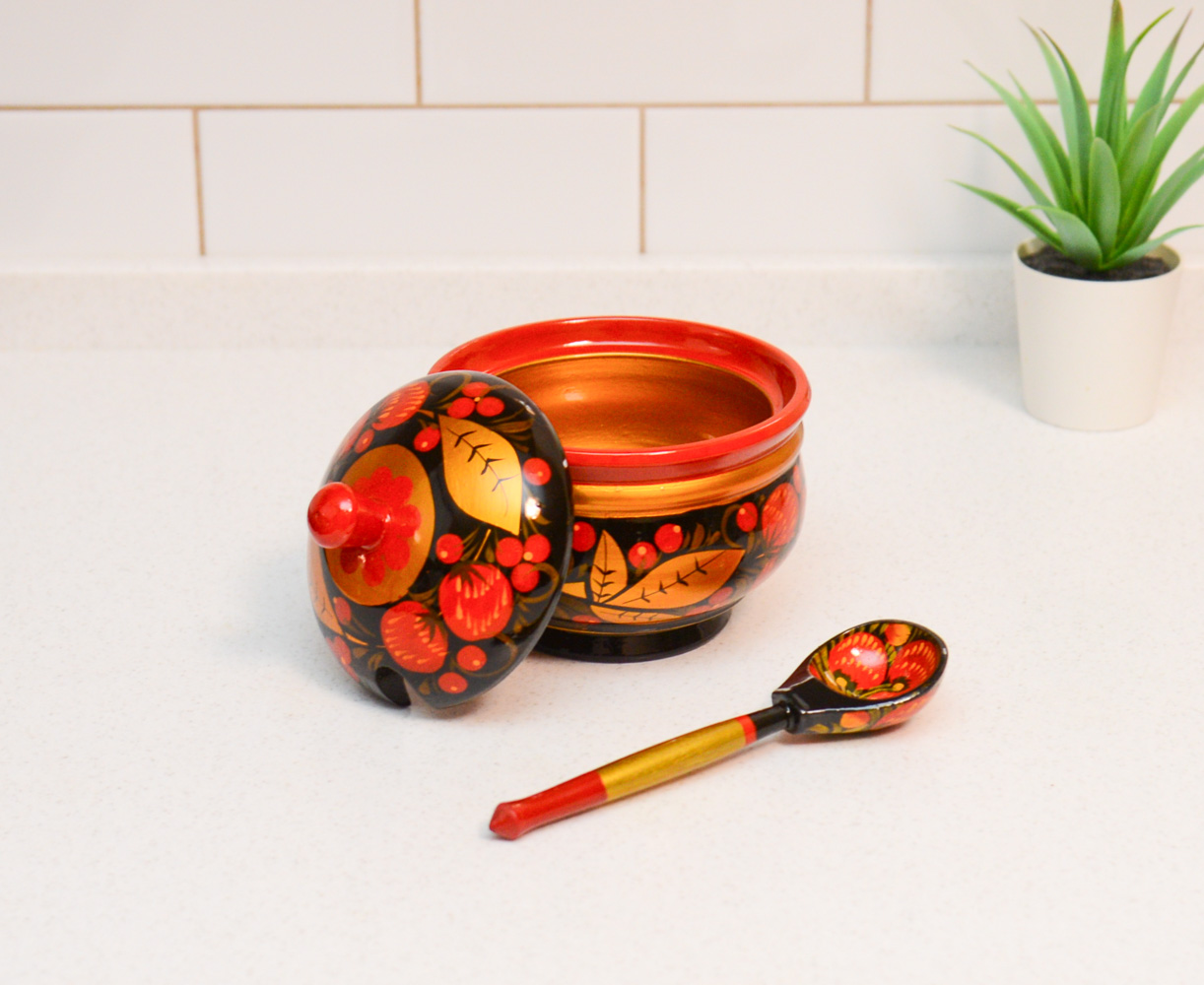 Сахарница деревянная небольших размеров с хохломской росписью. В комплекте с ложкой. Объем 0,29 литра. Можно использовать не только для сахара, но и для соли, специй, чая, кофе и т.д.