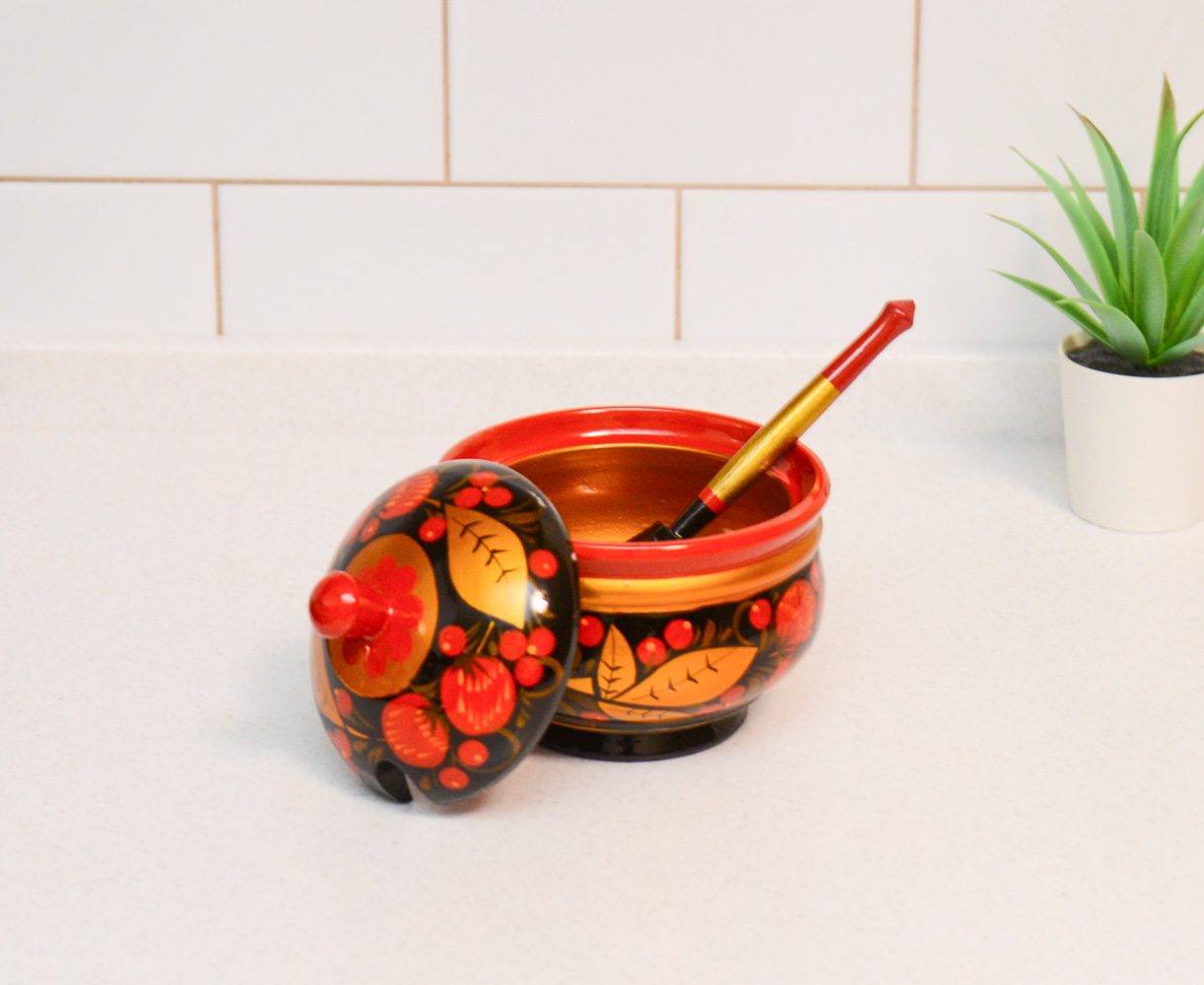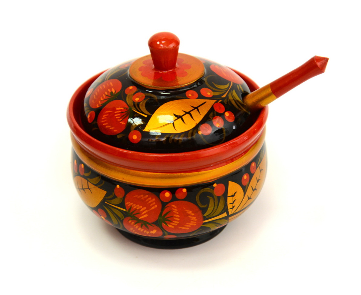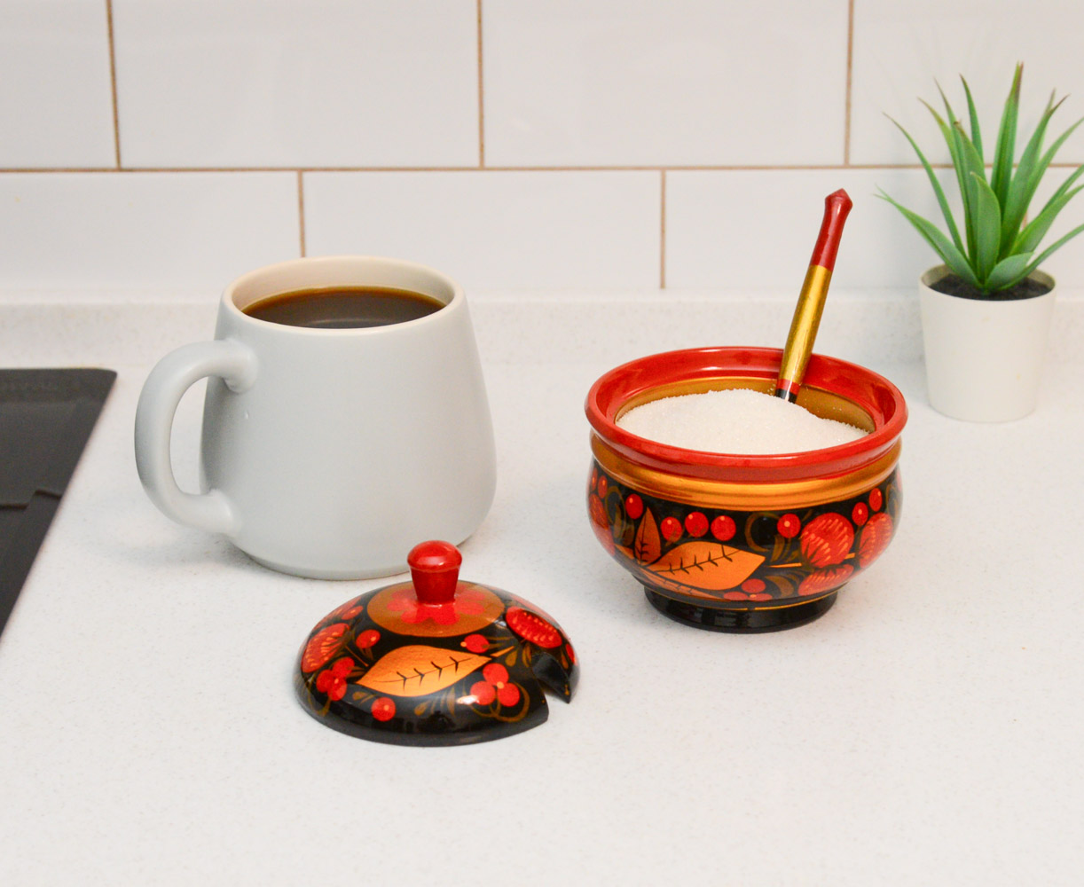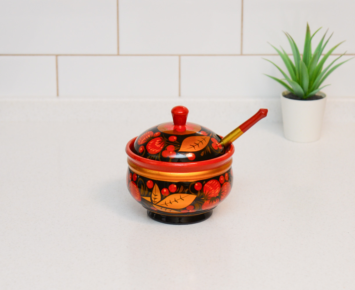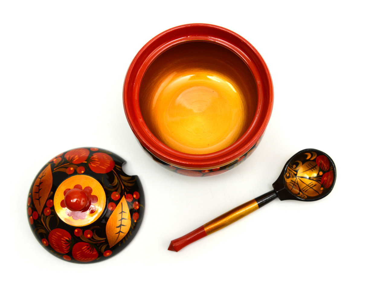 Сахарница деревянная небольших размеров с хохломской росписью. В комплекте с ложкой. Объем 0,29 литра. Можно использовать не только для сахара, но и для соли, специй, чая, кофе и т.д.