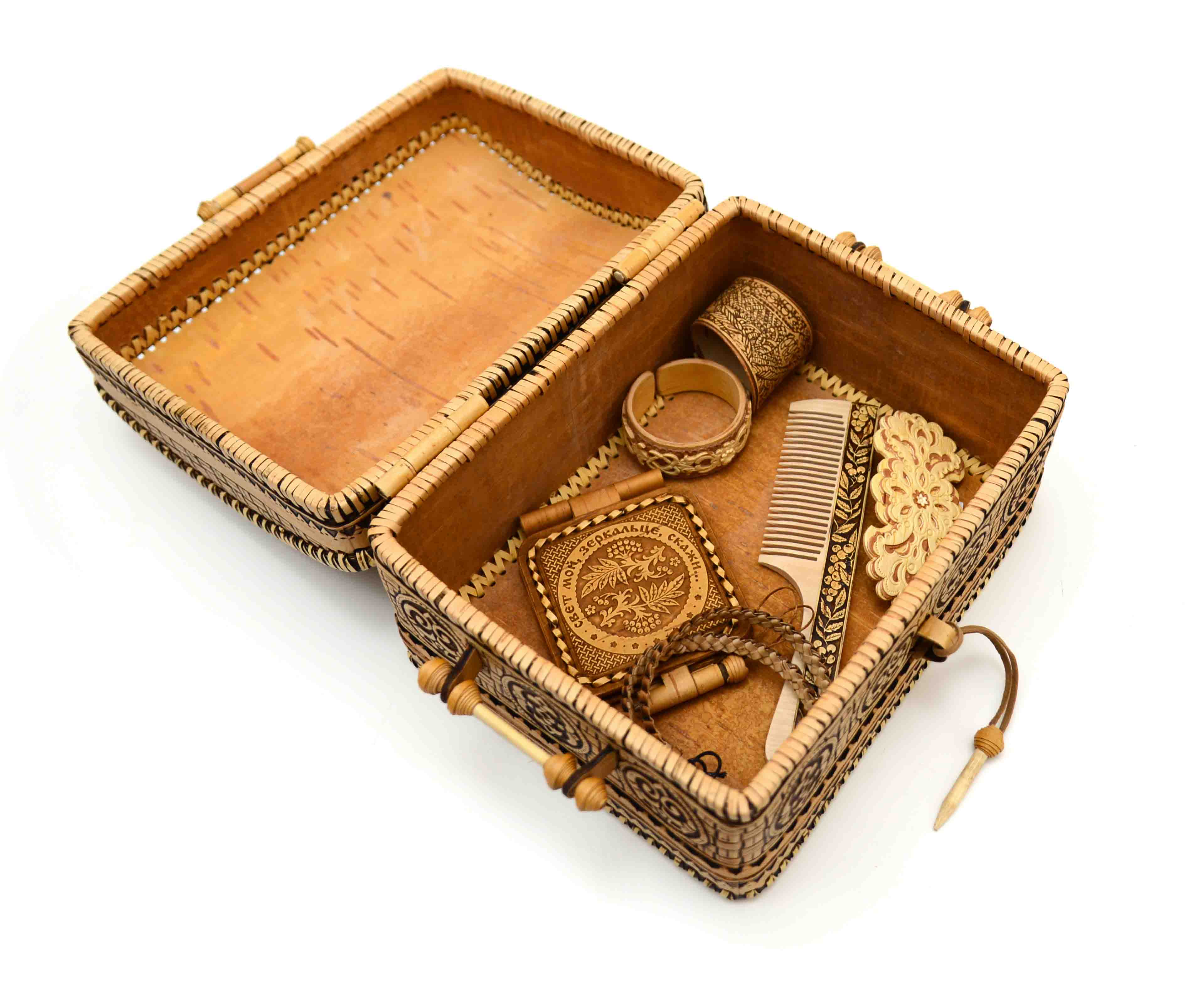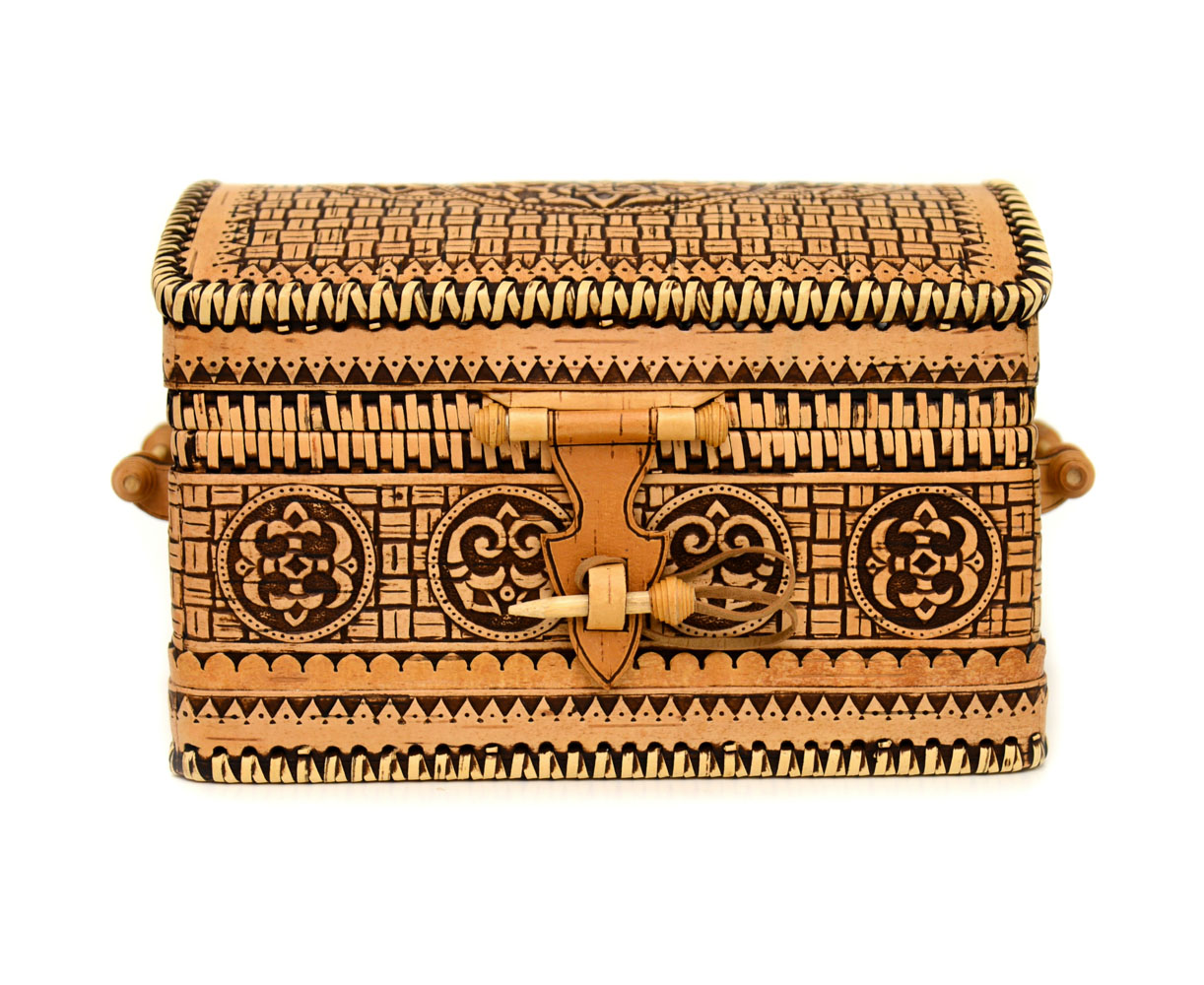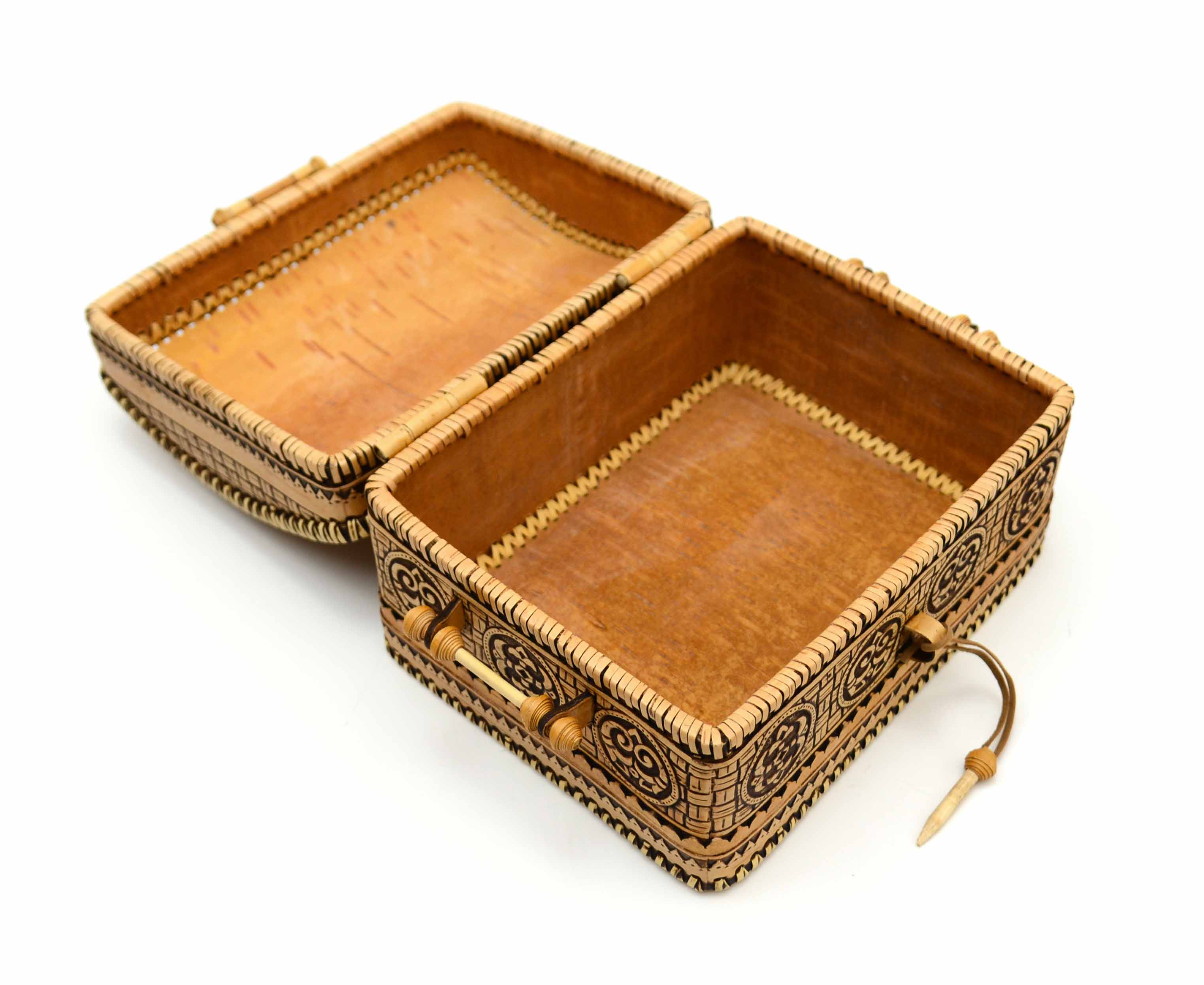 Сундук из бересты с крышкой на шарнире. По бокам есть ручки, закрывается на деревянный колышек. Ручная работа отличного качества. Объем сундука 3,3 литра.