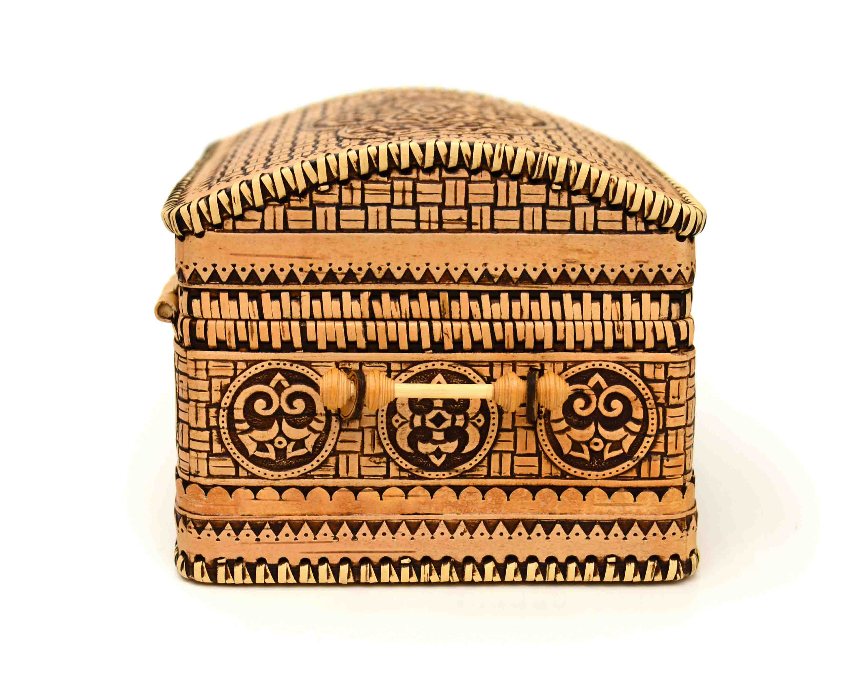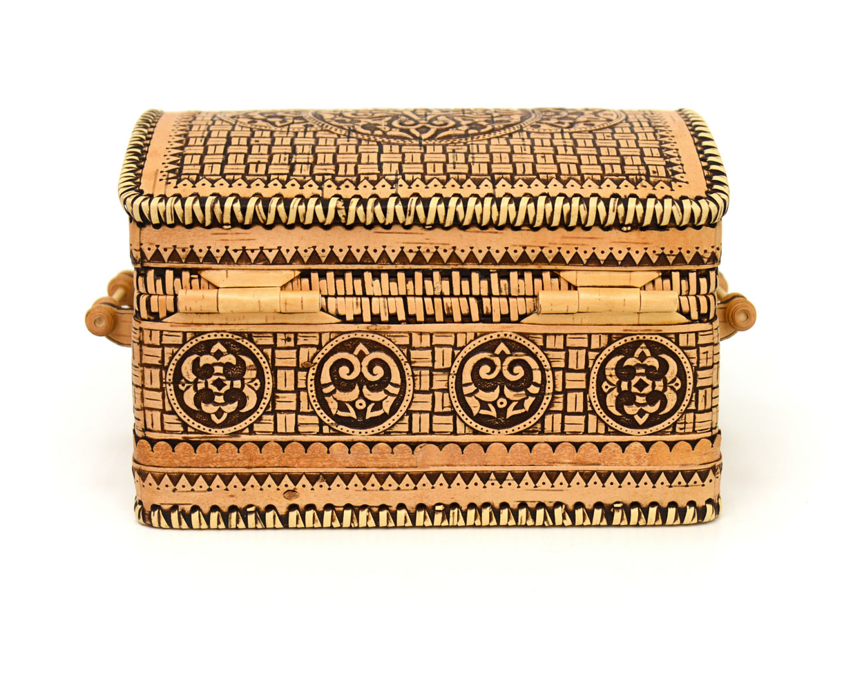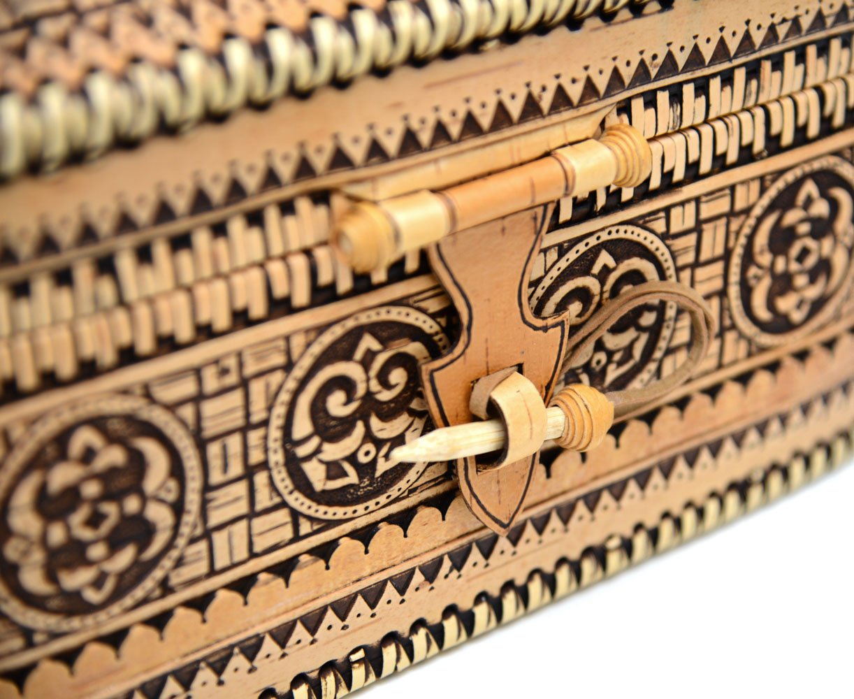 Сундук из бересты с крышкой на шарнире. По бокам есть ручки, закрывается на деревянный колышек. Ручная работа отличного качества. Объем сундука 3,3 литра.