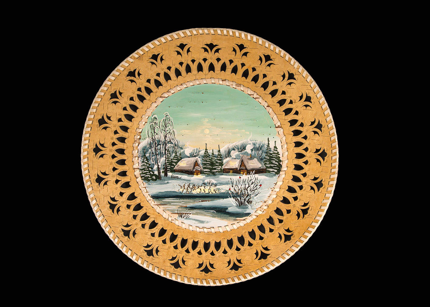 Тарелка из бересты расписная на стену. Сзади имеется крючок.
