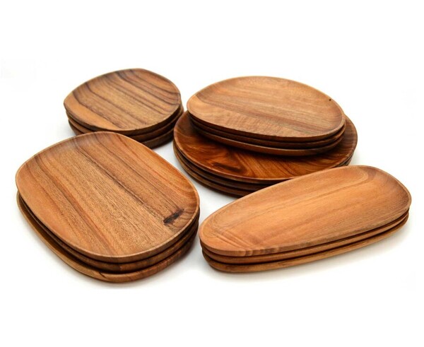 Тарелки из акации разнообразной формы и размеров: круглые, квадратные, ассиметричные, большие и маленькие.