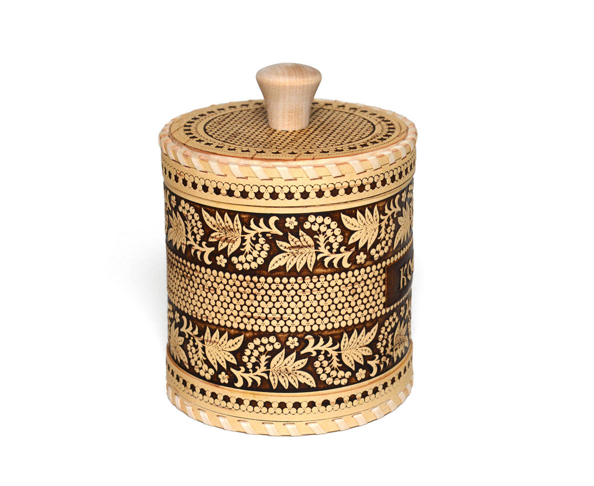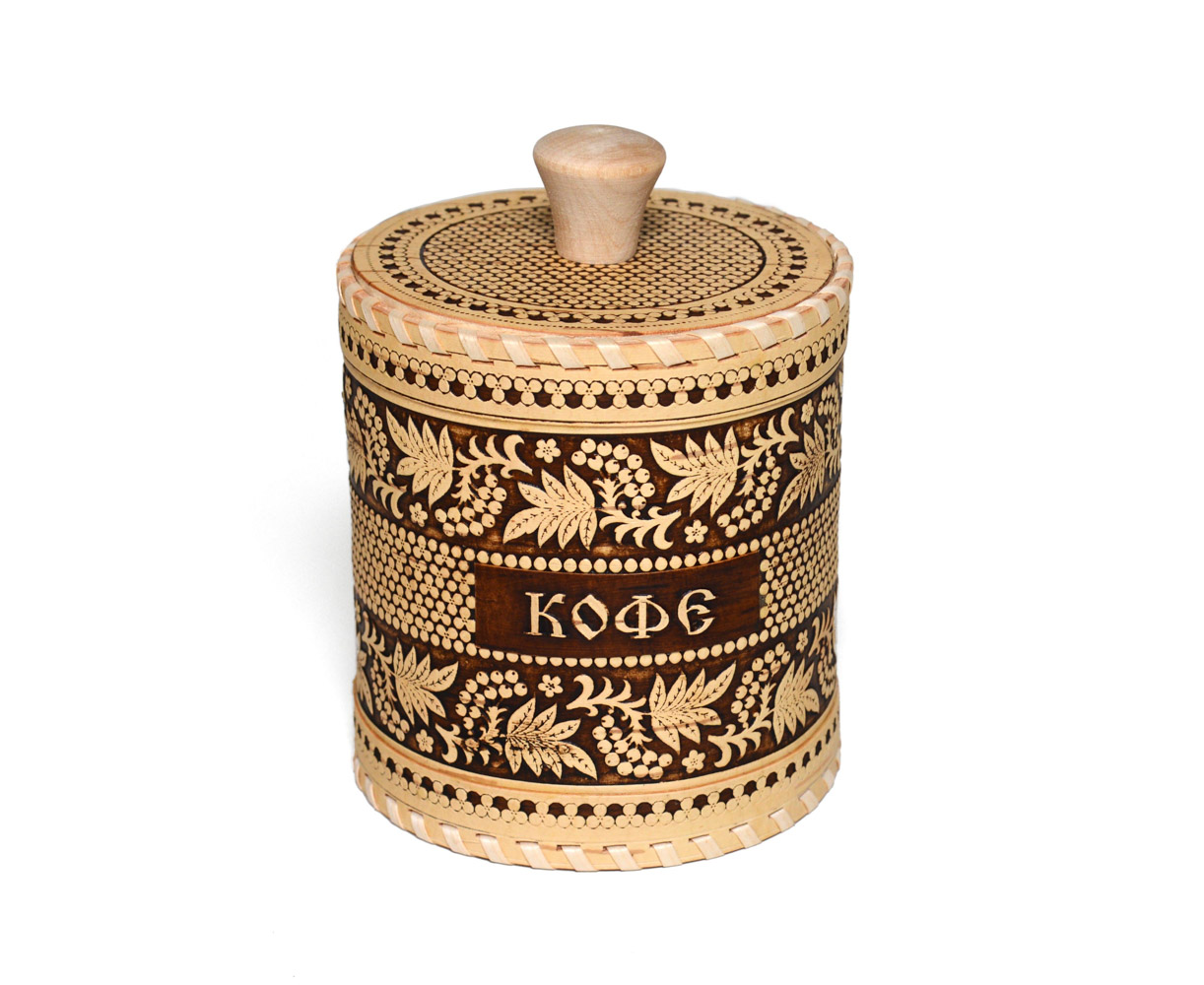 Красивый и практичный туесок для хранения кофе. Крышка и донышко деревянные. Туес вмещает 150 г растворимого сублимированного кофе.