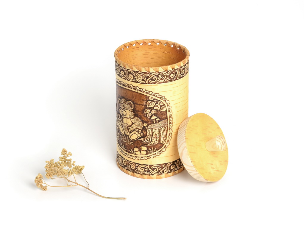 Туес из бересты подходит для хранения соли, сахара, чая, круп, трав и прочего. Также можно использовать в качестве шкатулки для хранения домашних мелочей. Приятный на ощупь. Удобный в использовании. Отлично дополнит и украсит вашу кухню и будет радовать вас и ваших гостей! На туесе изображен сказочный мишка.