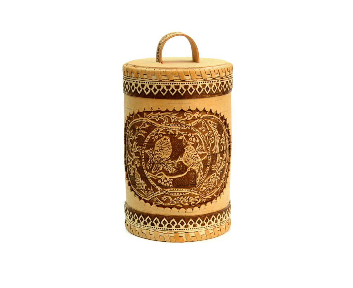 Вместительный туес подойдёт для хранения различных сыпучих продуктов: трав, специй, круп, соли, сахара.