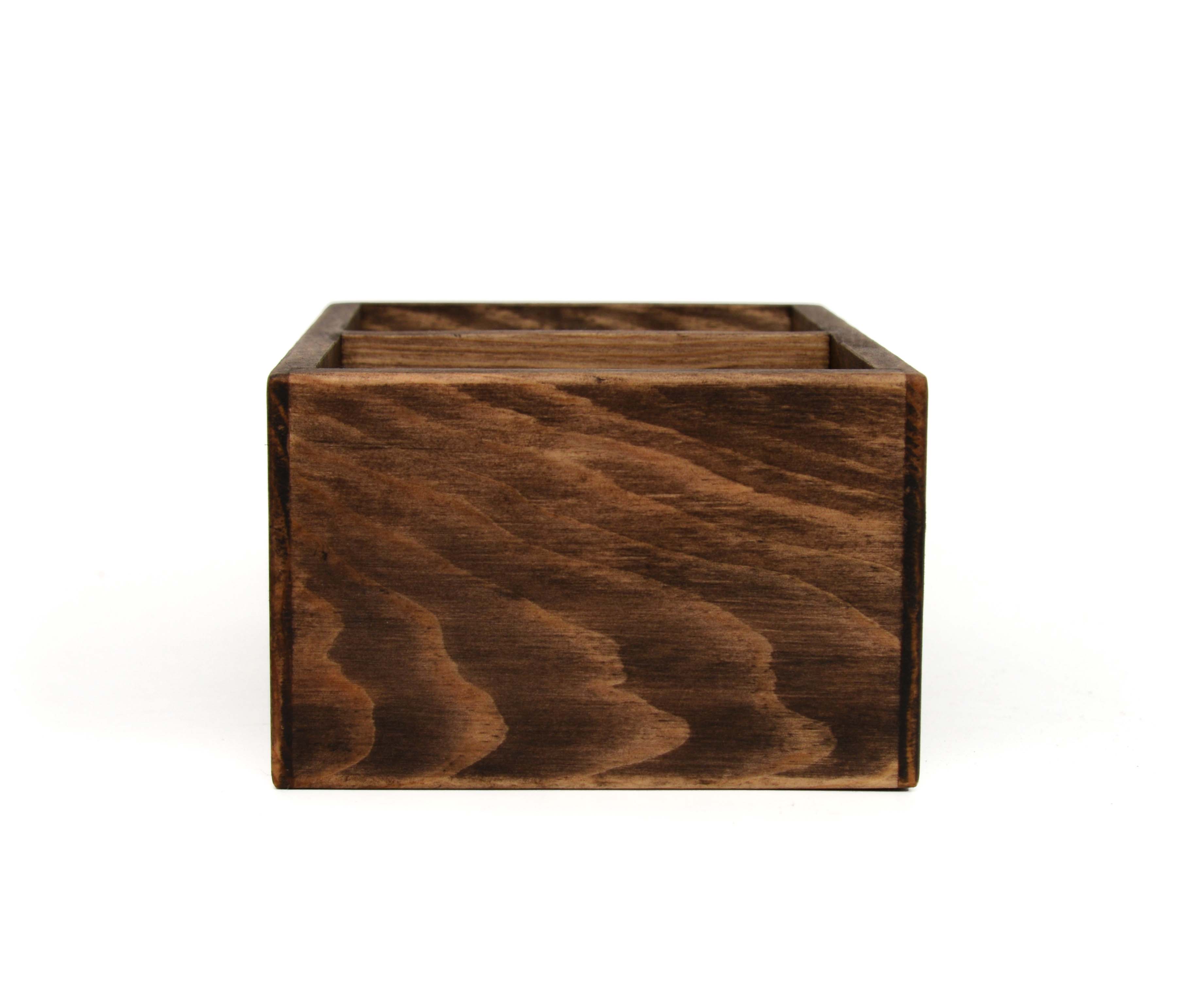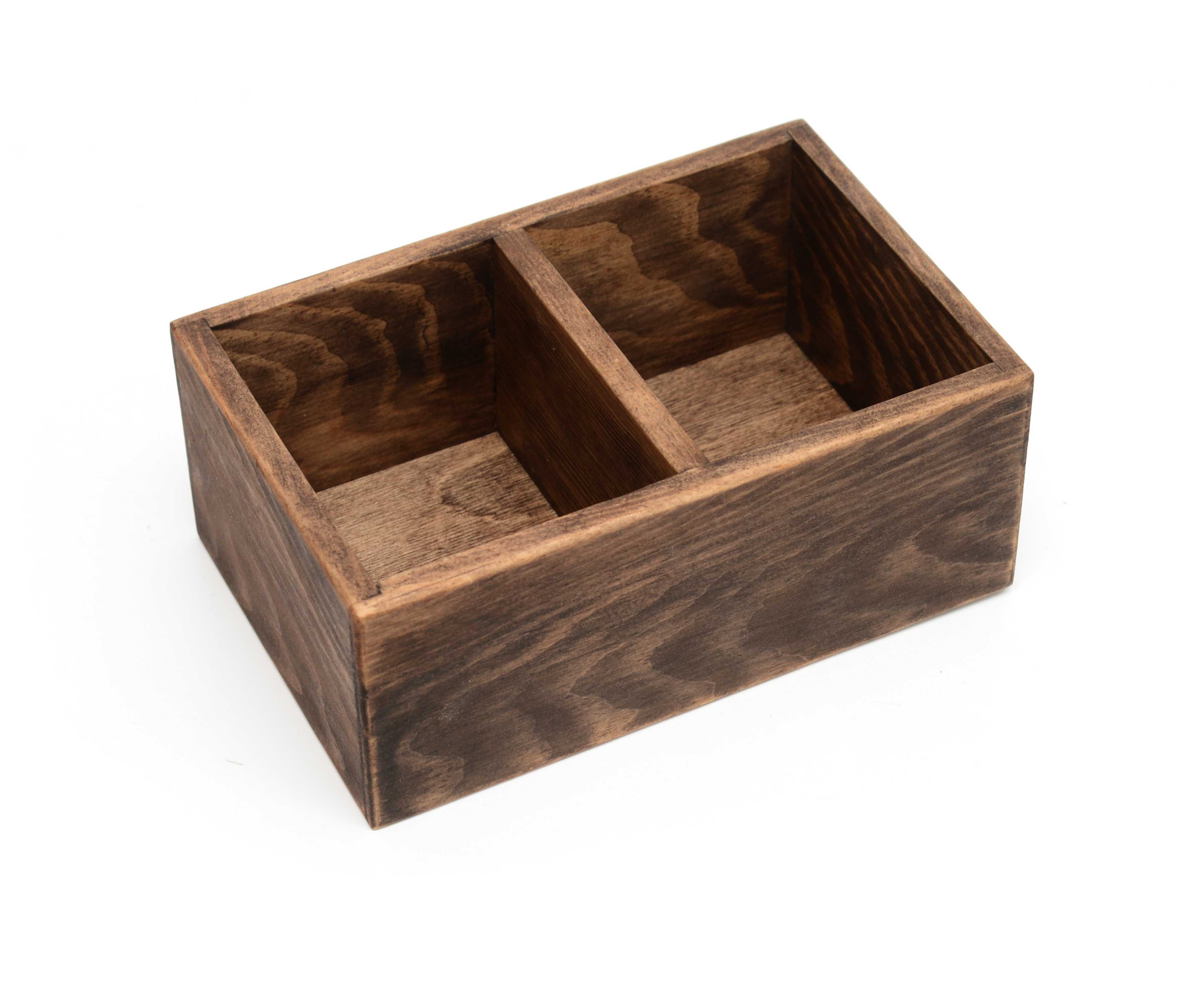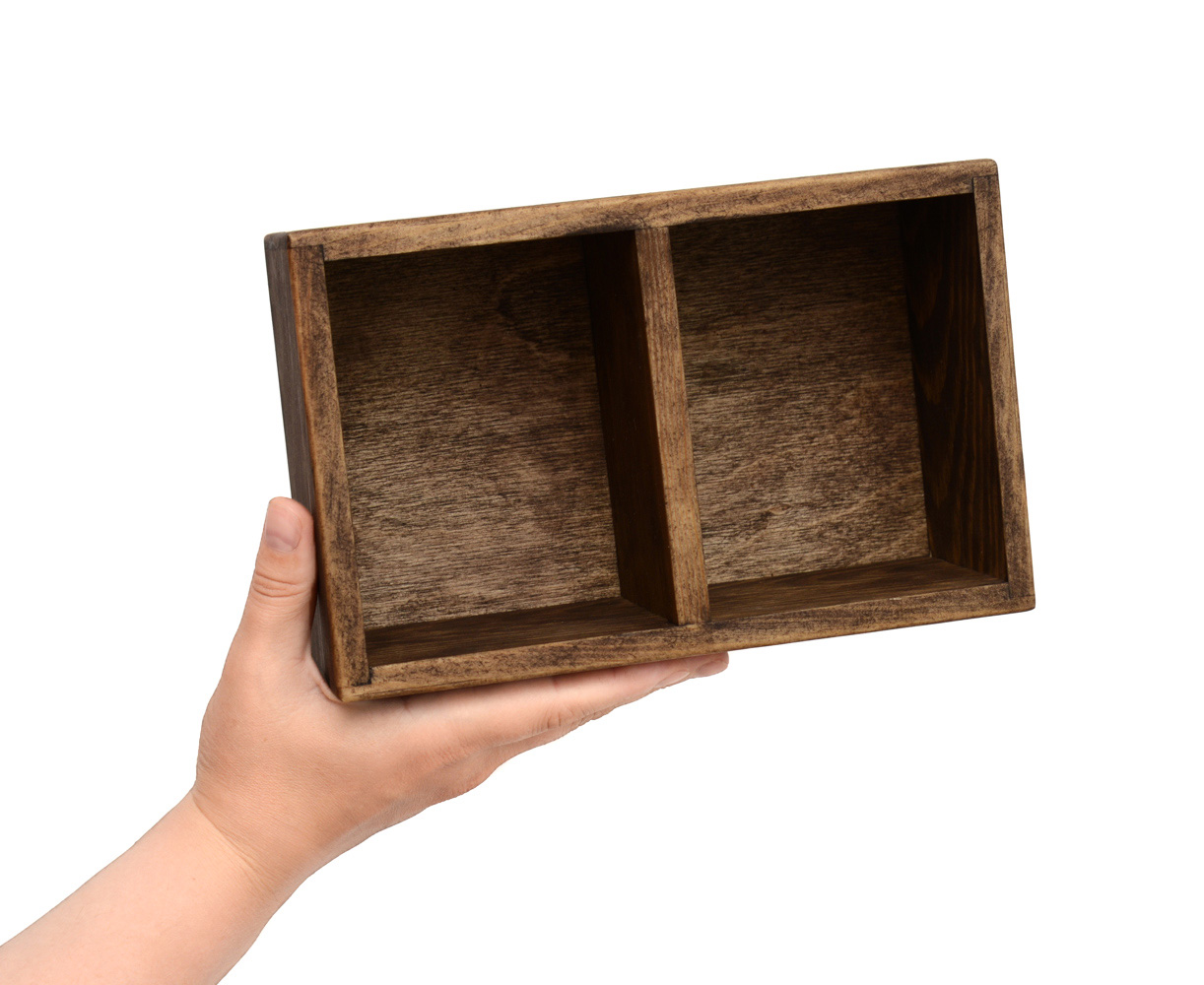 Удобный деревянный ящик небольших размеров с перегородкой внутри. Стенки сделаны из сосны. Дно из фанеры. Покрыт маслом. Цвет палисандр. Отличное качество. В отличие от аналогов, наш ящик собран без гвоздей, поэтому выглядит намного аккуратнее.