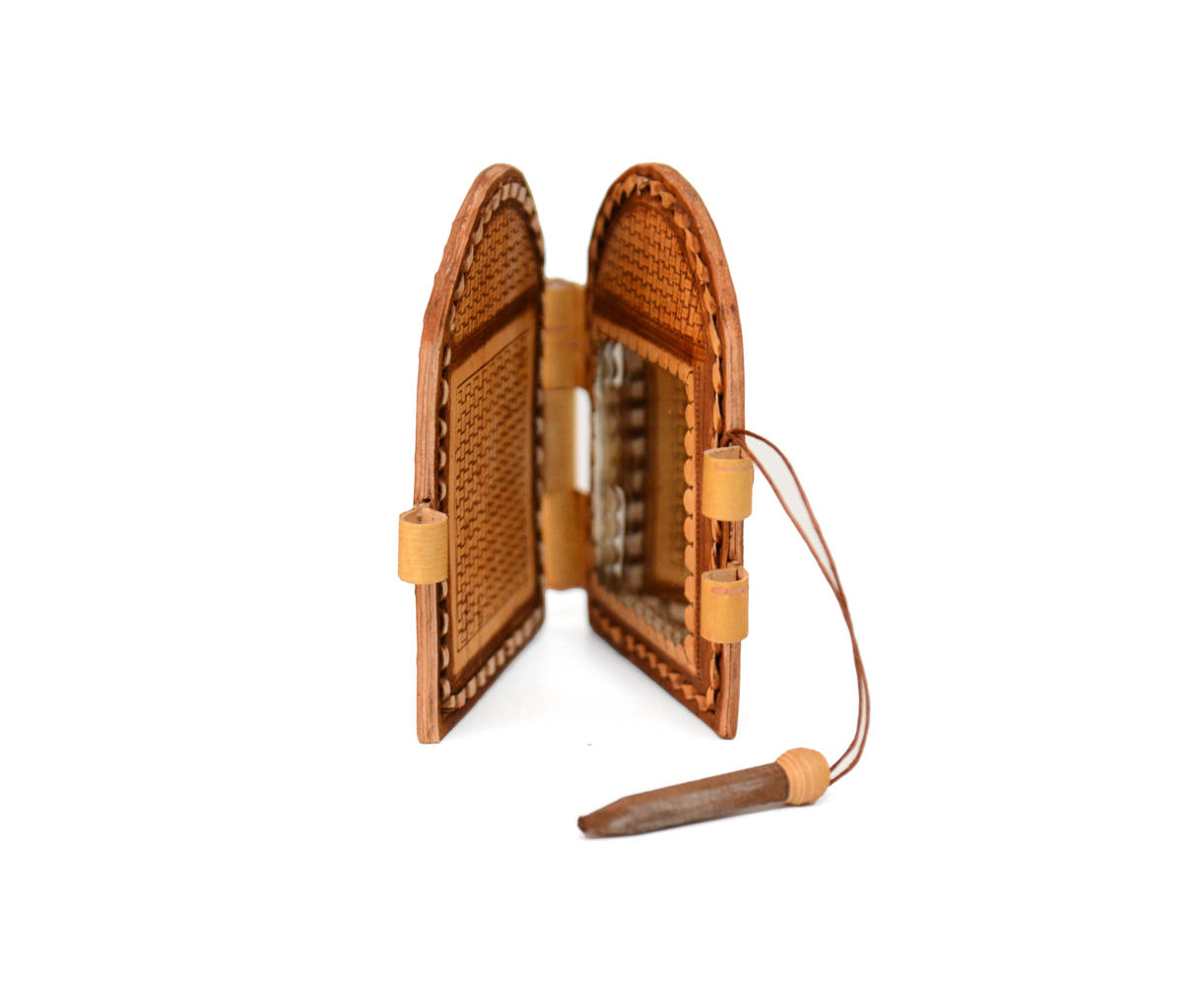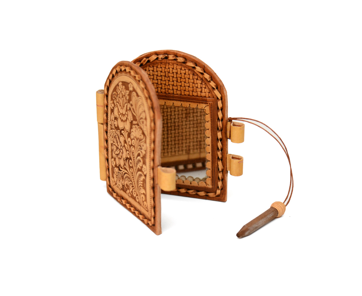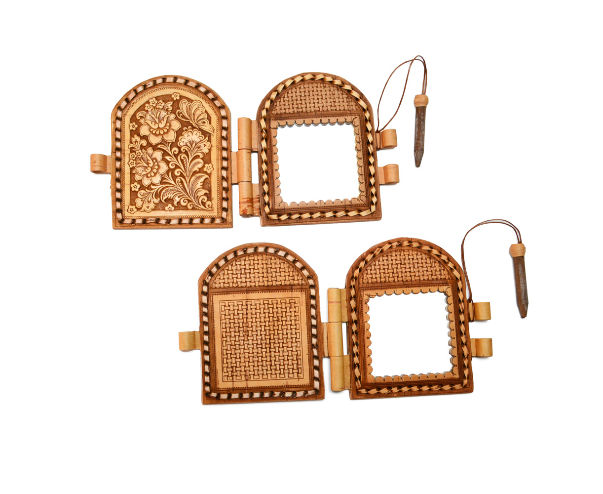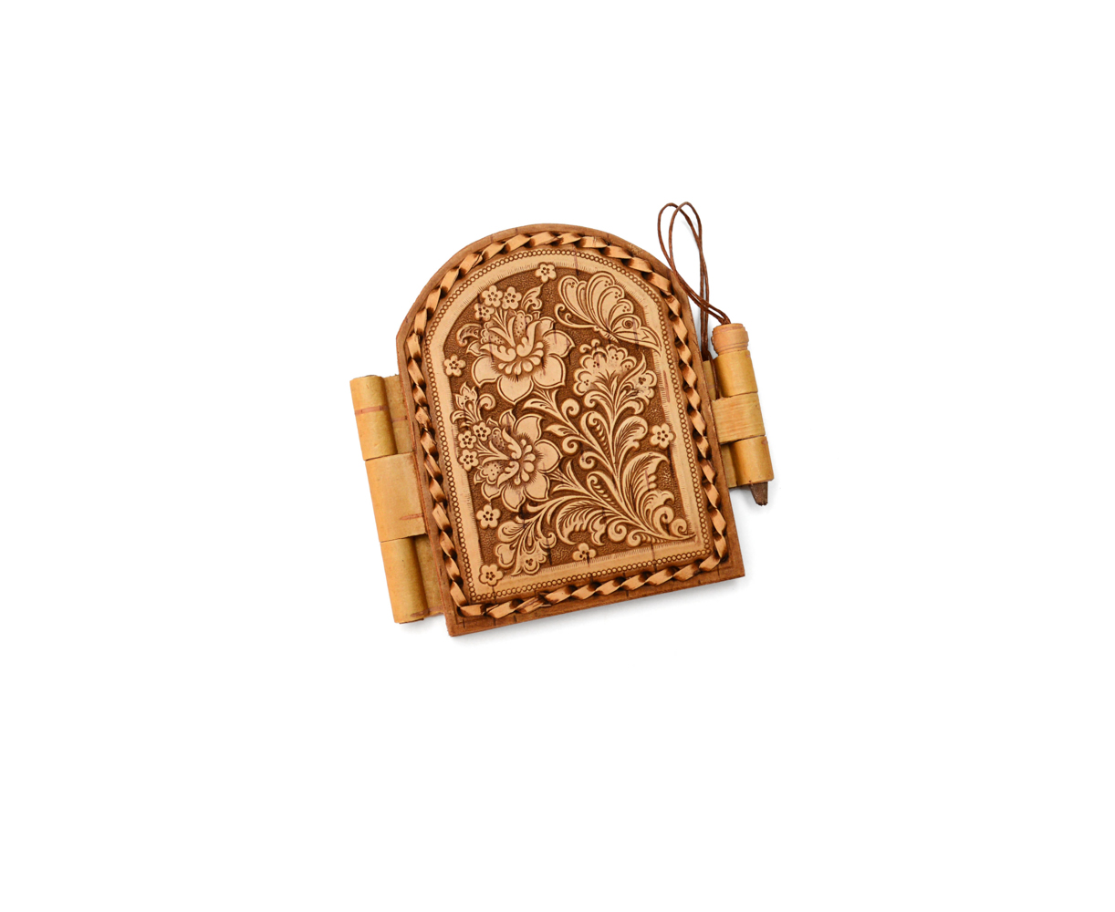 Зеркало из бересты небольших размеров. Крышка украшена цветочным рисунком, закрывается на деревянный колышек.